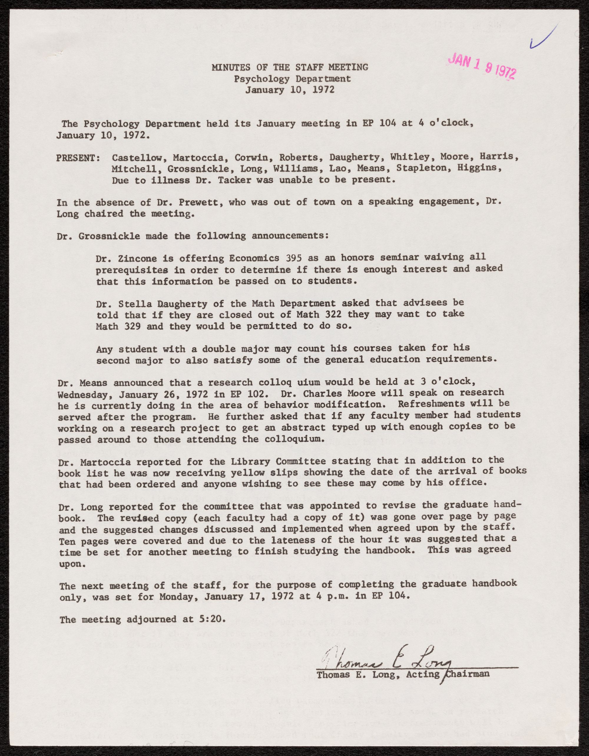 only, was set for Monday, January 17, 1972 at 4 p.m. in EP 104.