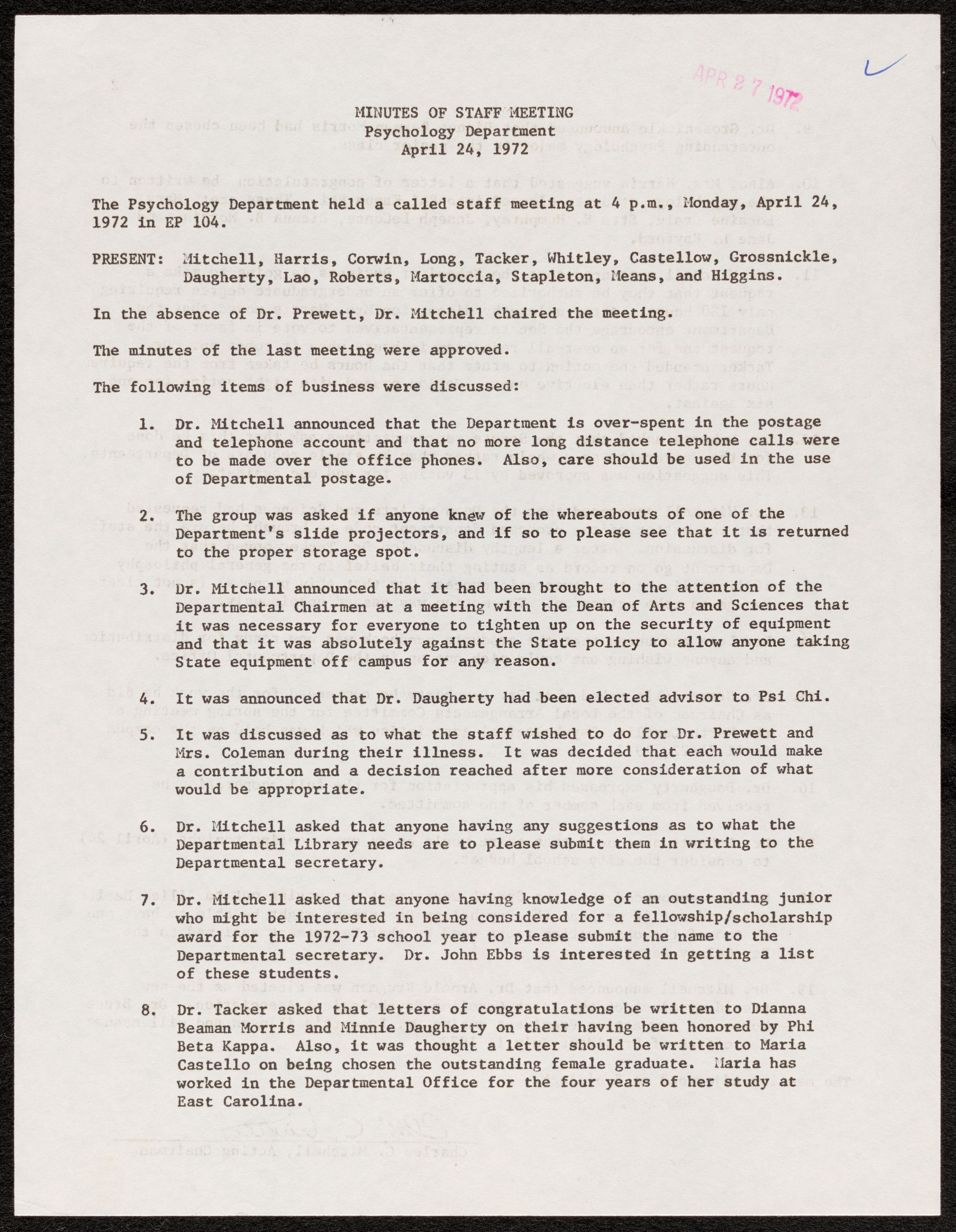 The Psychology Department held a called staff meeting at 4 p.m., Monday, April 24,