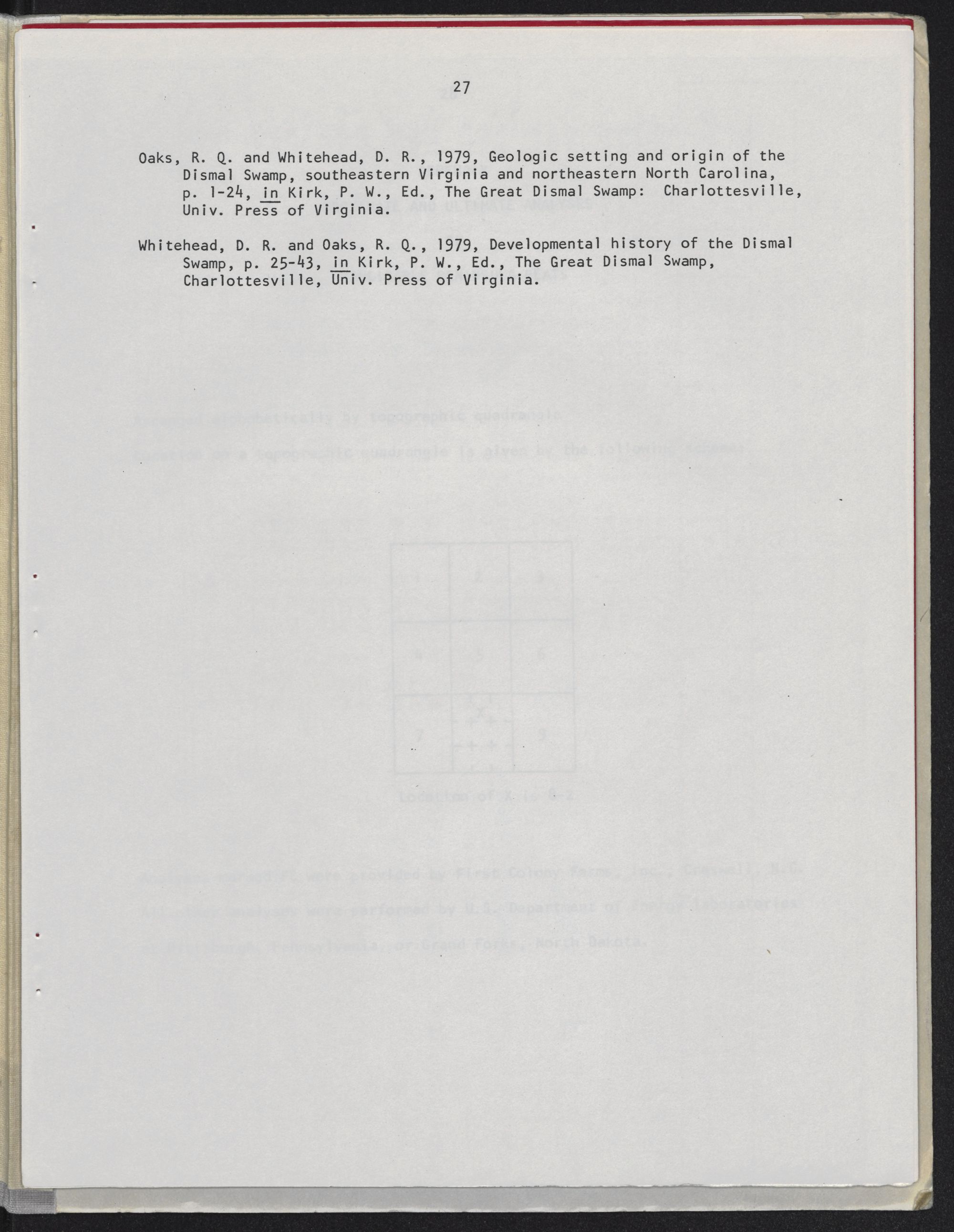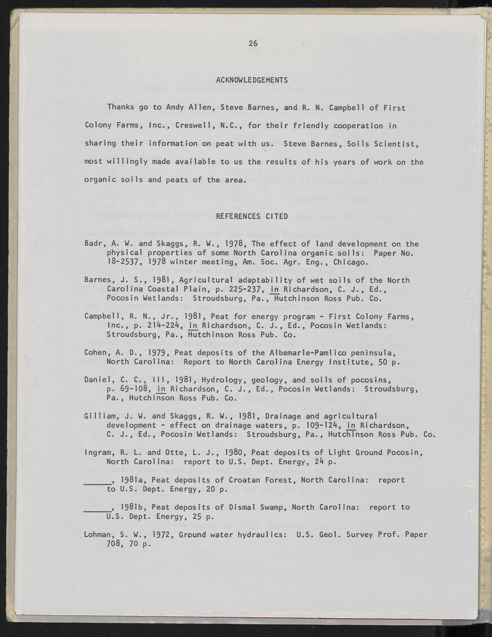Monograph of "Peat deposits of Pamlimarle Peninsula, Dare, Hyde, Tyrrell, and Washington counties, North Carolina," prepared for U.S. Dept. of Energy and North Carolina Energy Institute by Roy L. Ingram and Lee J. Otte. Published by the Department of Geology, University of North Carolina at Chapel Hill, 1982. Book is iii, 36 pages includes bibliography and one folded map laid in; physical items is 28 cm. "July, 1982" on title page.