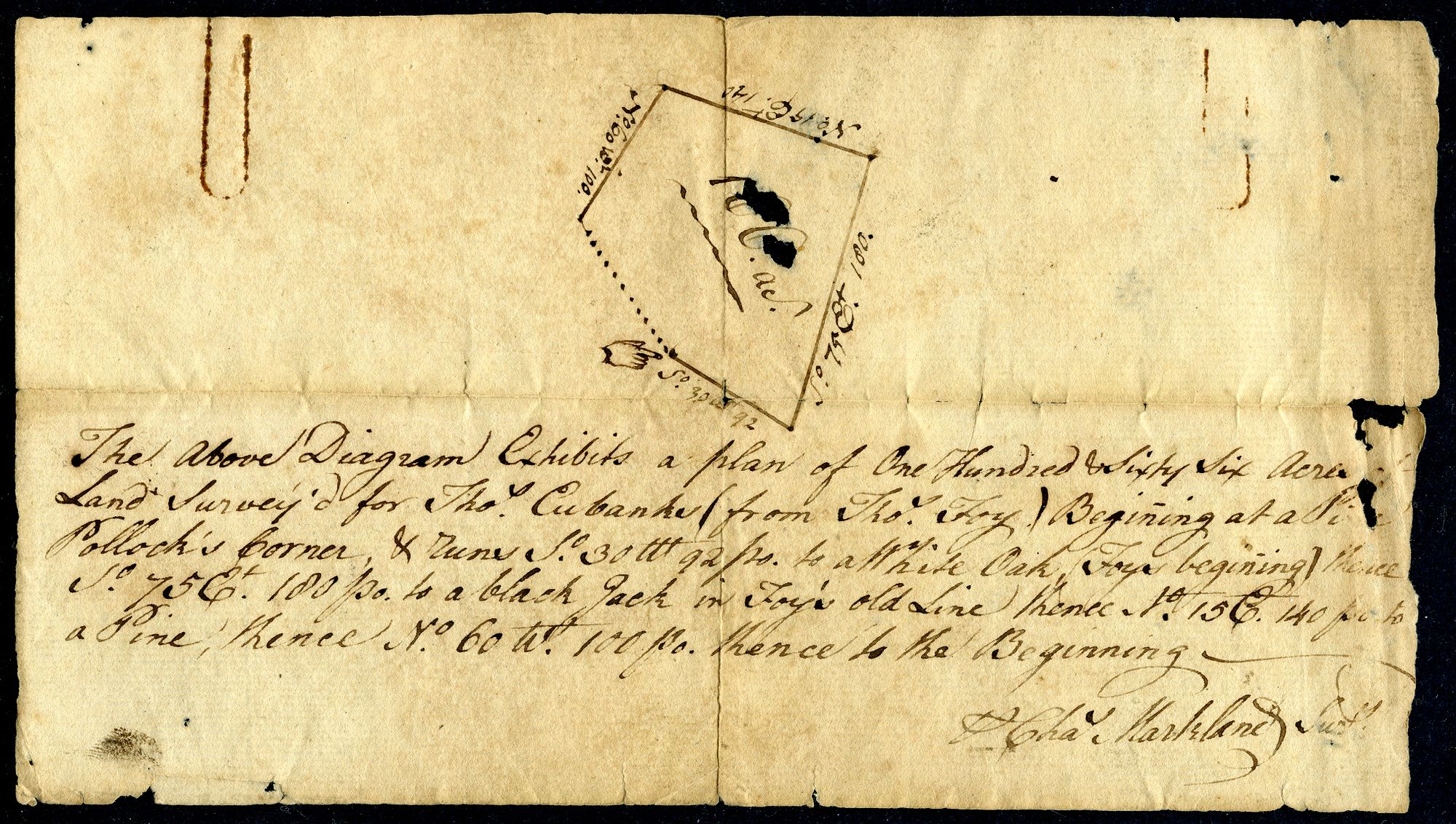 The above Diagram exhibits a plan of One Hundred & Sixty Six Acres of Land surveyed for Thos. Euband (from Thos. Foy) Beginninge at a Pine Pollock's Corner & runs South 30 W 92 poles to a White Oak, (Foy's beginning) thence South 75 E 100 poles to a Black Jack in Foy's old line, thence No.60 W. 100 poles, thence to the Beginning.