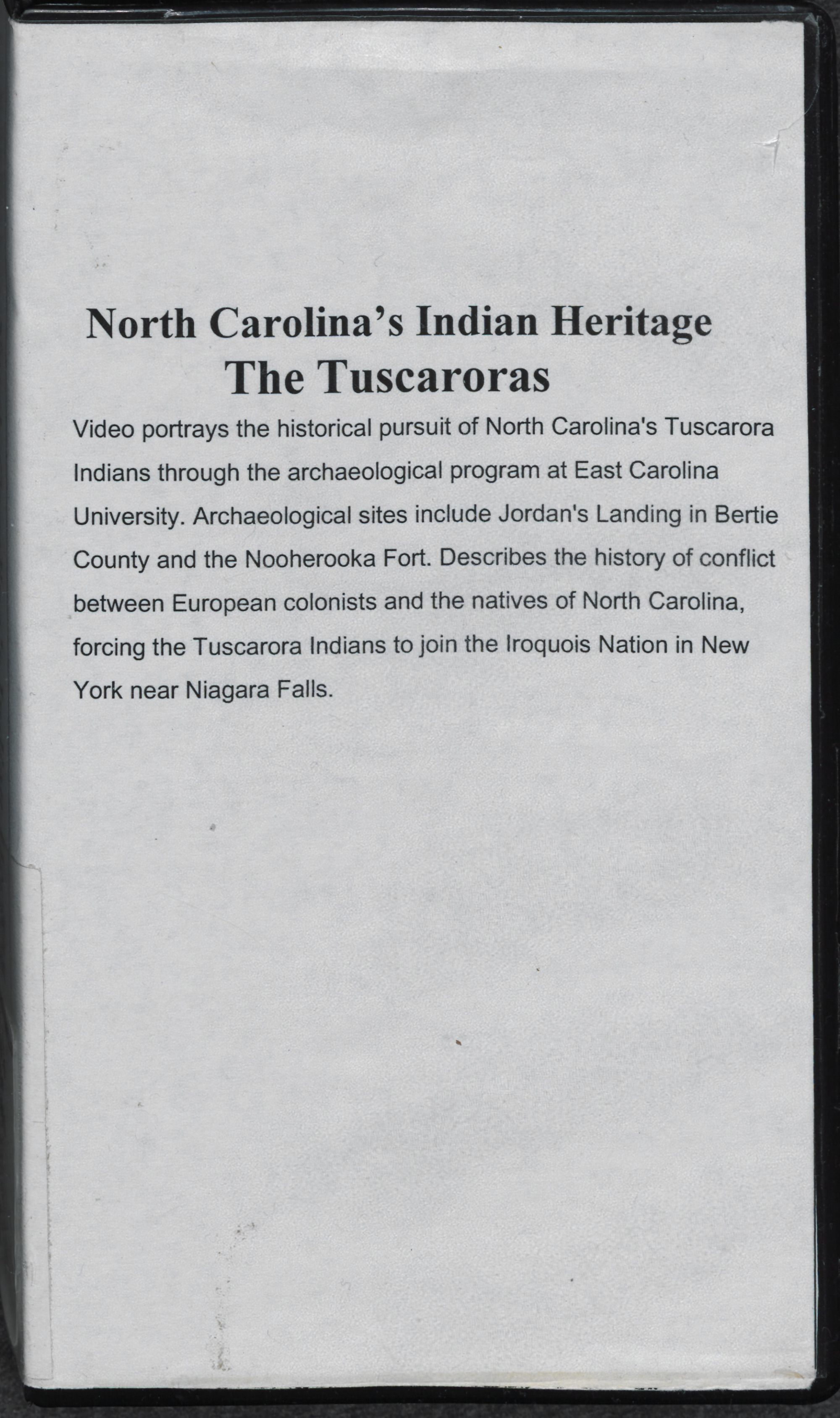 Video portrays the historical pursuit of North Carolina's Tuscarora Indians through the archaeological program at East Carolina University - 2001