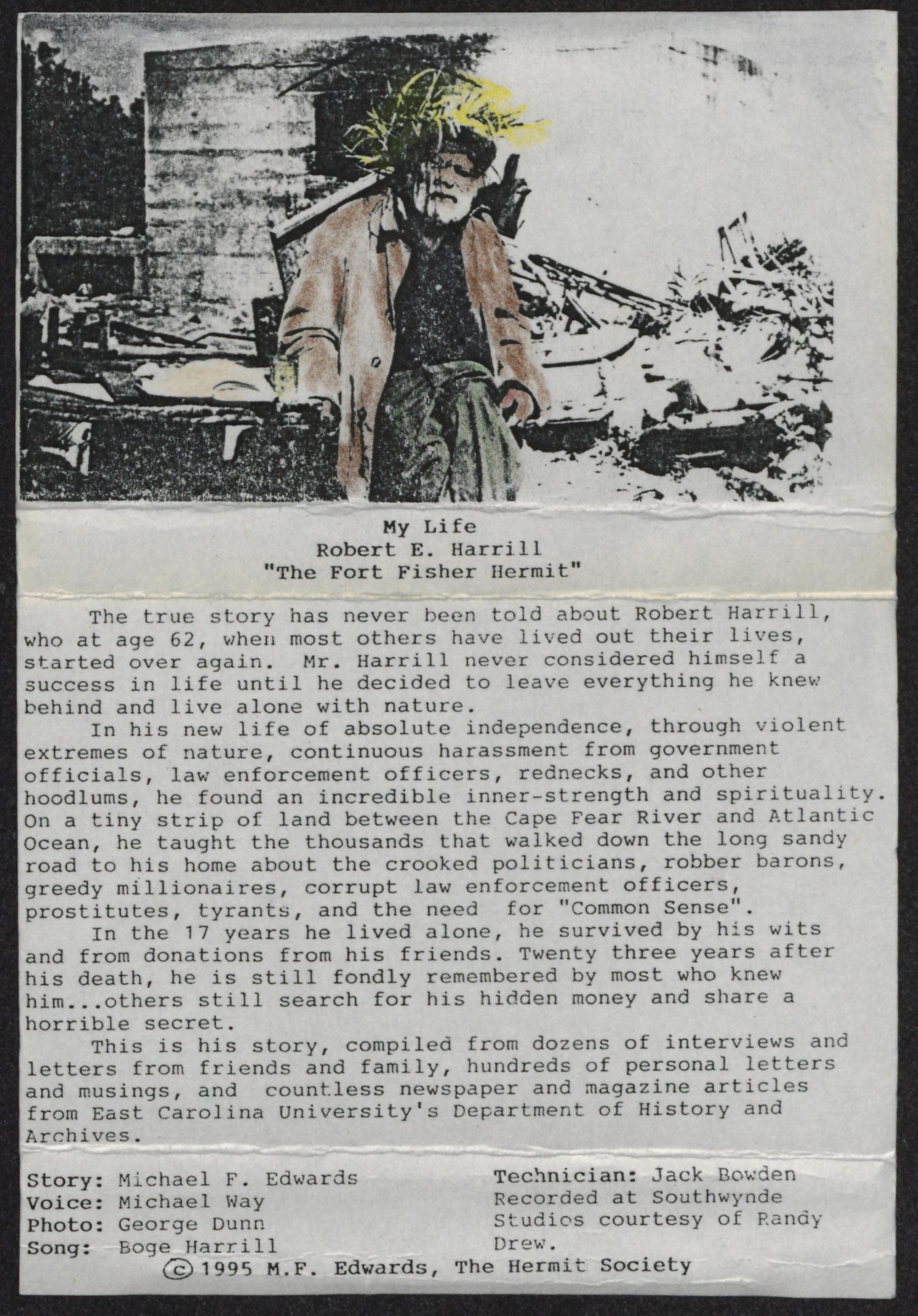 They never took the time to understand me. That's all. It's getting hard for an honest man like me to get ahead in this world. 500 million people in this world and half of them suckers. I guess I'm a sucker. That's why I'm so poor. After I escaped from the hospital that summer. I knew it was my last chance to catch up with the rest of the world. I decided I couldn't get a fresh start where I was. No I have to get far away. My stomach was aching because I hadn't eaten for days, too tied up in knots. Before folks at the hospital have probably stopped looking for me by now and besides my family, I pretty much given up on. I had met Dr. William Marcus Taylor, a famous psychologist in Spruce Pine the day after I had freed myself. He set me straight on a lot of things for the first time in my life. If I hadn't went across his booklet at the hospital, tell him about his lecture on biopsychology that weekend, I probably stayed confused my entire life. That Dr. Taylor what an inspiration. I finally found someone who understood what I had been saying all those years. And to have someone for once in my life agree with me, oh would have was something he allowed me to sign up in his bio psychology course that day. That was the beginning of my big turnaround anda chance to finally get my diploma. I hadn't thought much about education, since I decided to drop out of school after studying for the ministry at Gardner Webb. My professor had an attitude that I detest in religious folks. They think their beliefs are the only ones in the world, and that no one else knows anything about God, life or death. It's almost against the law for an individual to think for himself anymore. Around the summer of 55, I knew it was time to make a new life for myself. And I decided to hit the highway. A big black car slowed down and pulled off the road sending up clouds of dirt. Harrill's the name I told the kid behind the wheel of the Chevrolet as I threw my bag at my feet and close the door. All I've got is a nickel and a bad name. I wouldn't have that if someone hadn't given it to me. Go into Fort Fisher. I said, you know, that's where the Confederates fought the last battle for independence. I'm gonna find a home, write a book about tyrants. Yep, I'm a writer, wrote for a paper and worked as a liner typist for over 20 years. You know, all those crooked politicians up in Washington work for the millionaire's. So do those folks up in Raleigh. The common man like you and me, don't stand a chance. If we play by the rules those politicians make these days. I'm 62 years old and I can tell you I've met them all rich man, poor man, the crooked politician, the freeloaders the hoodlums know what I'm saying, young man, I found out the meaning of life. Have you ever thought about that? The key is to have faith in yourself, faith in others, faith in your present and in your future. Do you have any bad patterns in your life young man, you know, you can change those bad patterns, fear patterns, I call them. Those old patterns can be annihilated and new ones be born and they can grow and you can reap the harvest in rich living of the soul. Well, that was a little over 17 years ago. Most people don't call me by my real name anymore. Most normally as the Fort Fisher Hermit, some call me pops, Robert, Hermie makes no difference to me what they call me. So as long as, they called me to dinner. Quite a lot has happened to the country in these last few years. Assassinations, wars, hundreds of 1000s of new mouths to feed. I really feel for the poor people in this country, and the welfare people, they'll keep you in perfect misery. You've got to learn how to take care of yourself, like I've done here at Fort Fisher. Sometimes you have to just walk away from all the negatives in your life and start over. You know, I originally came here in 1955 for a vacation. But getting back to the ocean has renewed my spirits. Given me strength helped me change my goals in life. I've got to help people think for themselves, use common sense and express their individuality rather than suppress all of those like you're supposed to do when you're part of society. I've learned a lot about society since I left it. I've had a chance to study the people who come visit me here in the jungles and you know, they think they're studying me. I've been beaten, robbed, thrown in jail, even kidnapped. These used to be the Badlands when I got here in 55. A lot of sick people used to come here and tear up the place, drank whiskey straight out of the bottle they did you tell me if that's not a sign of a sick personality. Some of the people used to come in here late at night and use my place for lovemaking. One night about midnight a couple of months ago. A man I know brought an overweight woman out here and ran me out of my bunker laid her right down on my cot. Squashed it flat on the flounder. That's the reason I keep the place in the mess I do to discourage people using it in that way. And of course I'm a collector. Always have been people throw such good things away. I can always use the things people throw away for something. Jars, bottles, pieces of scrap wood. Take this pool table we're sitting at. The telephone company were throwing it out way. Some folks call my place a junkyard. What Henry Thoreau used to say. However mean your life is meet it and live it. Do not shun it and call it bad names. Life looks poorest when you are richest. The fault finder will find faults even in paradise. Love your life poor as it is. Don't use the roads much at night anymore. It's too dangerous. Usually I walk through the woods when I go to town, so quiet and peaceful. And it gives me a lot of time to think. Long after I came here, as I was walking up to Carolina Beach to buy me a hat, two men offered to take me to town in their automobile. And to drive me around for 15 minutes these bullies turned on me and demanded $20. I didn't have $20 and I thought they were going to kill me. One o
