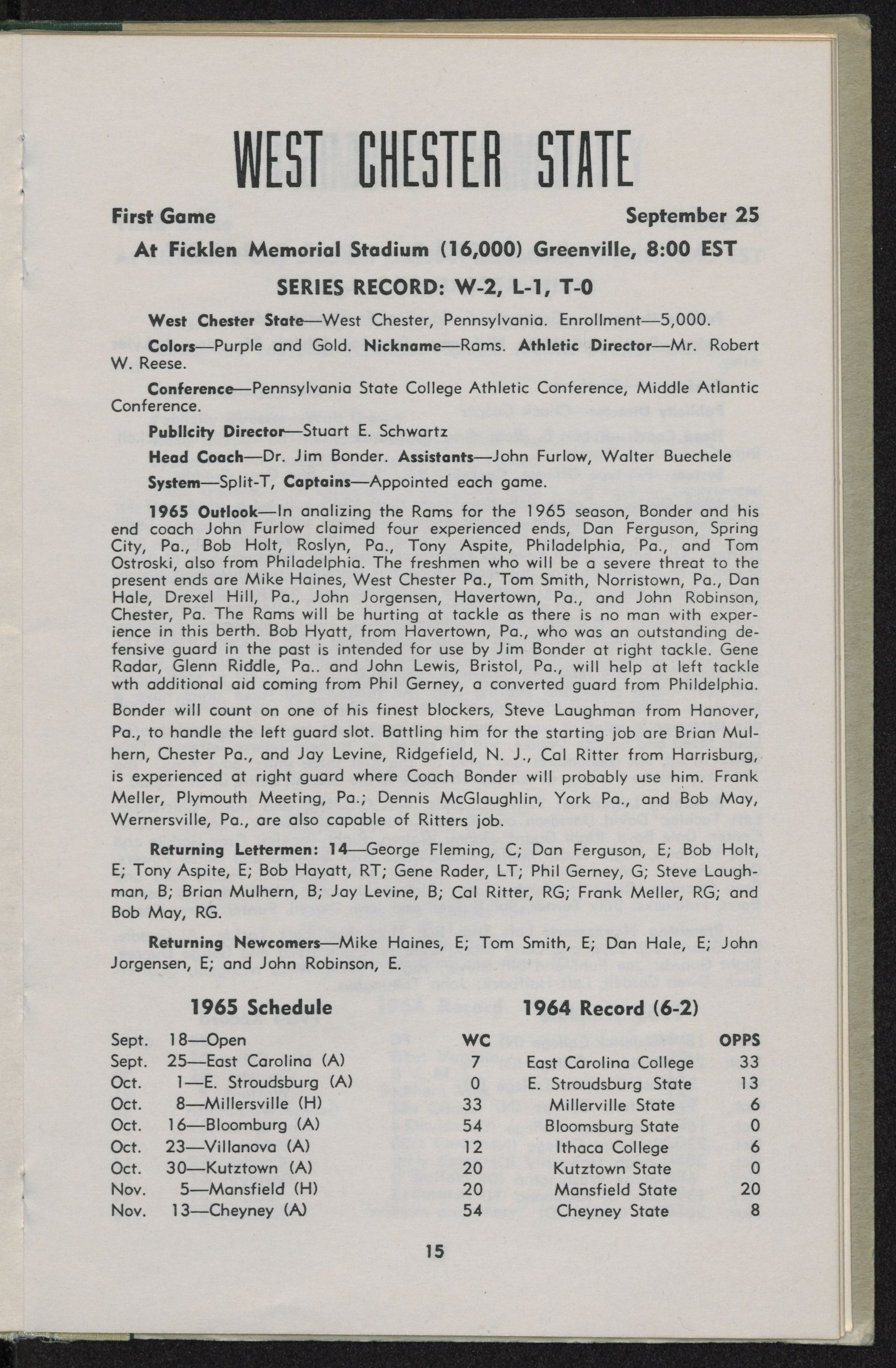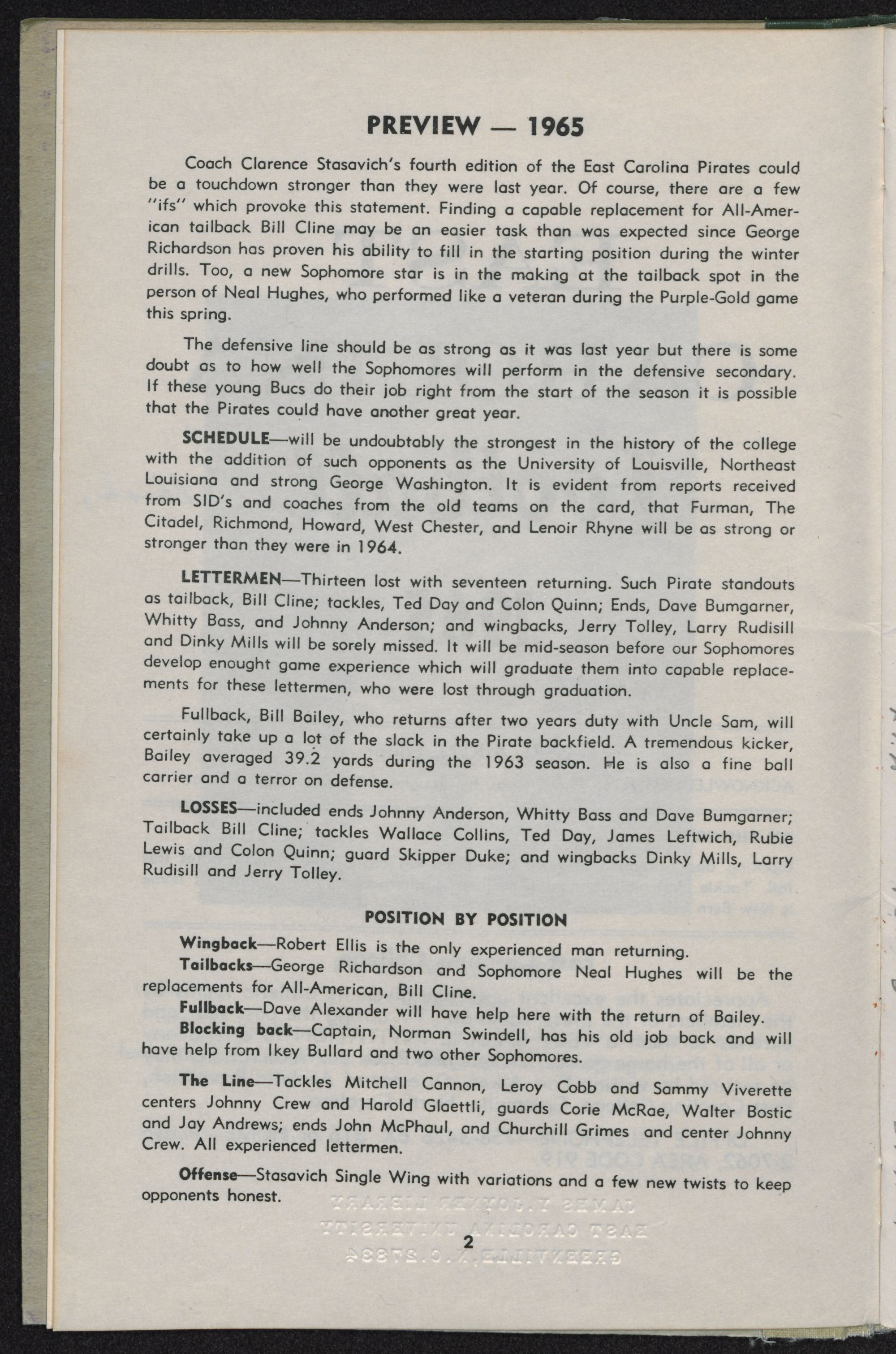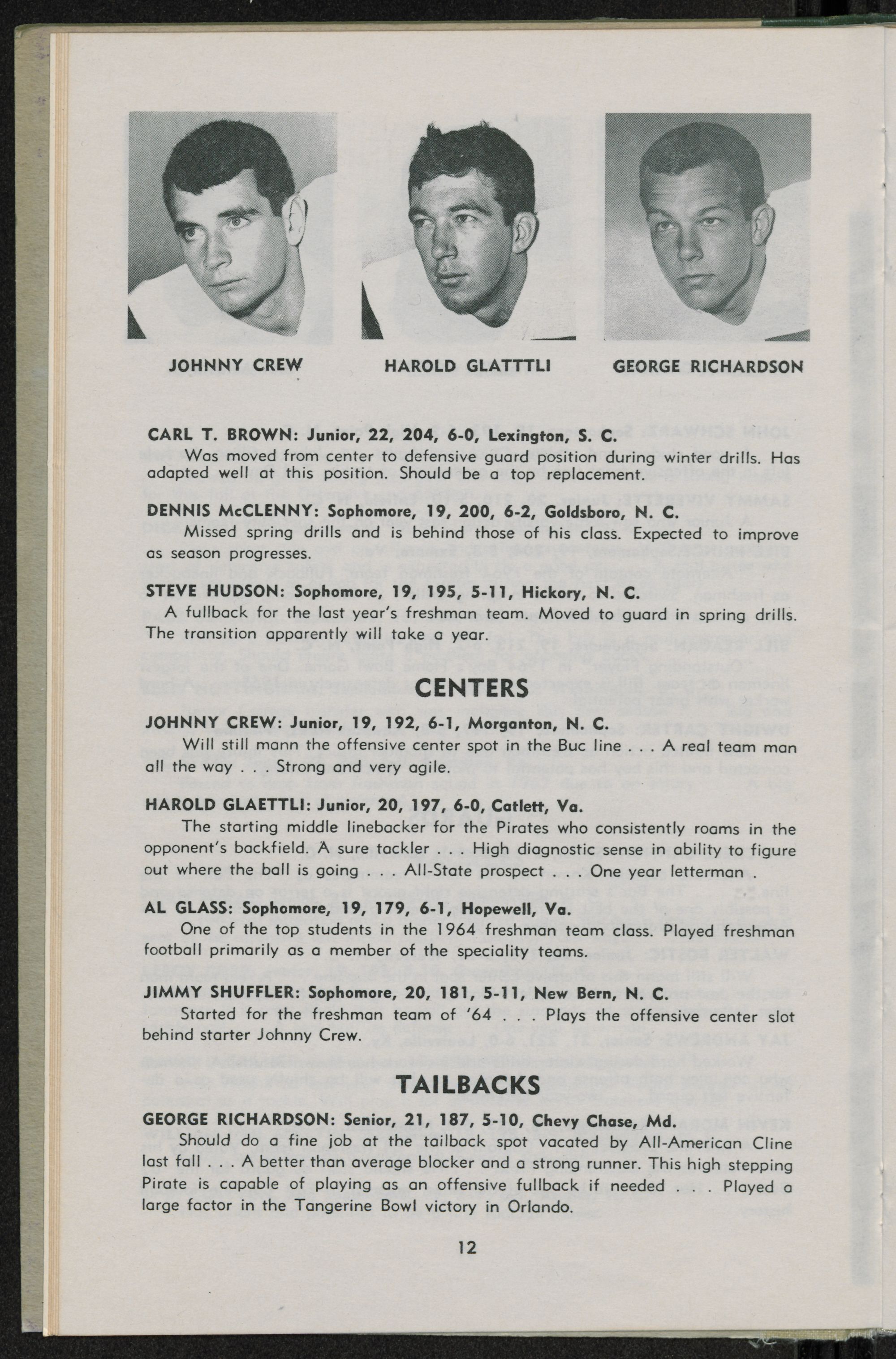 East Carolina College Football Media Guide for the 1965 season. Lists the roster, coaches, game schedule, and stats from the previous year.