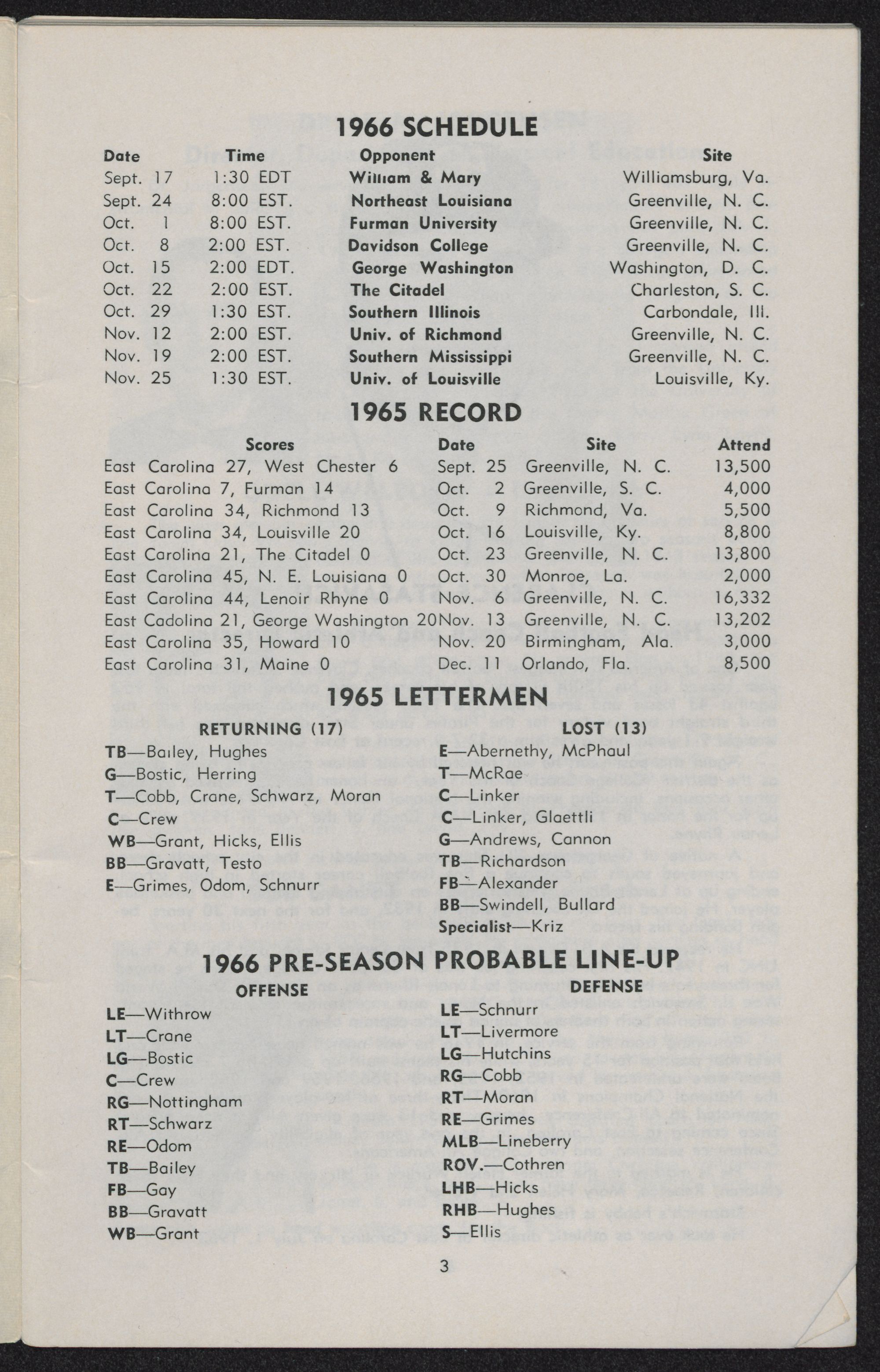East Carolina 45, N. E. Louisiana 0 Oct. 30 Monroe, La. 2,000