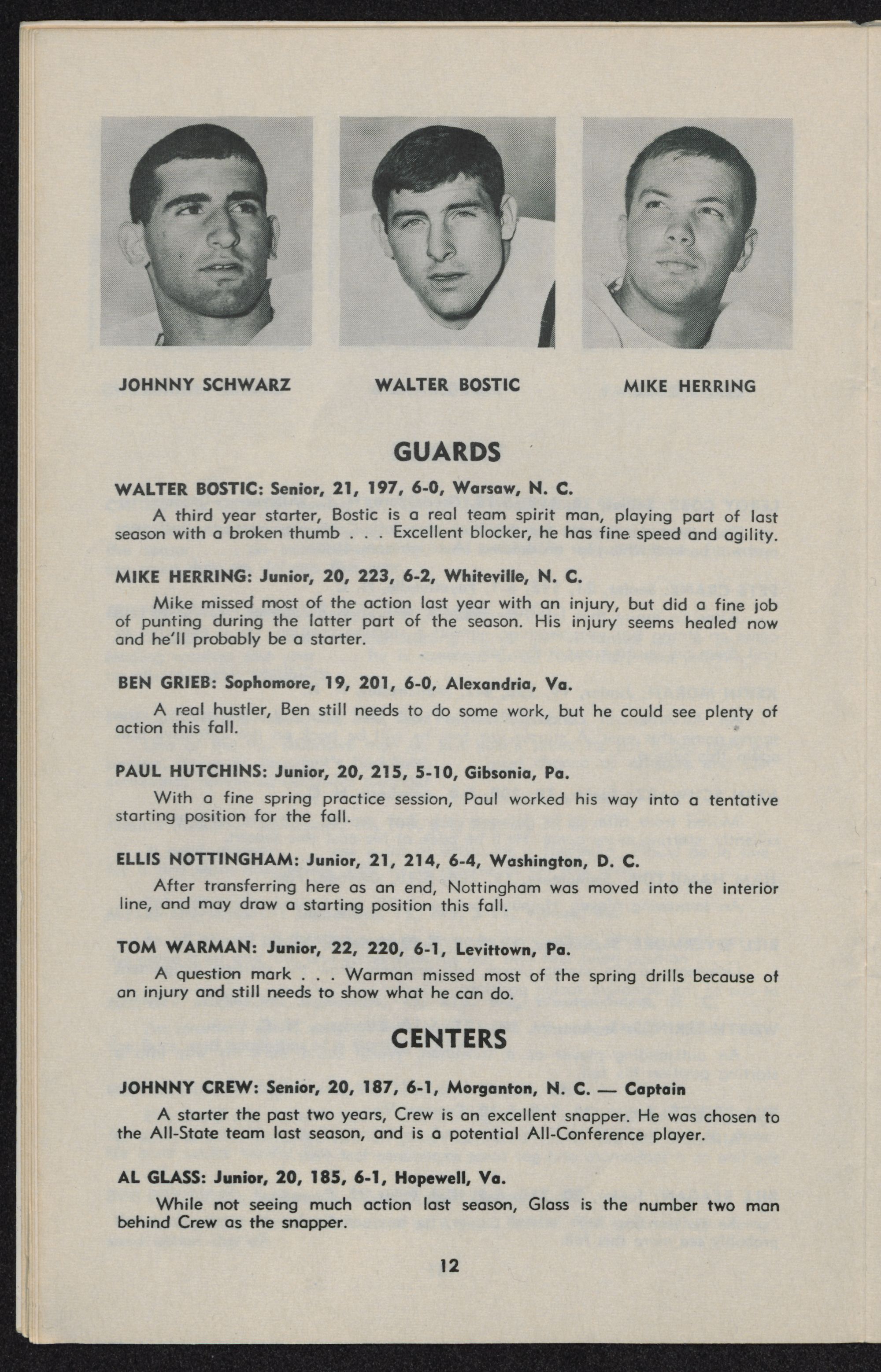 Bostic, tackles Leroy Cobb, Pete Crane, John Schwarz and Kevin Moran; center