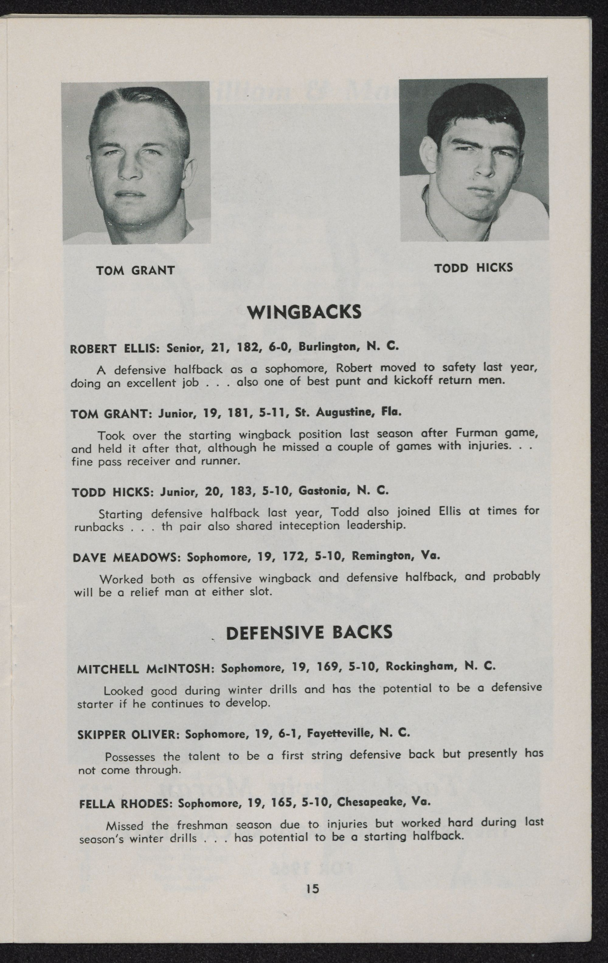 Johnny Crew; wingback Tom Grant; defensive backs Todd Hicks, Neal Hughes