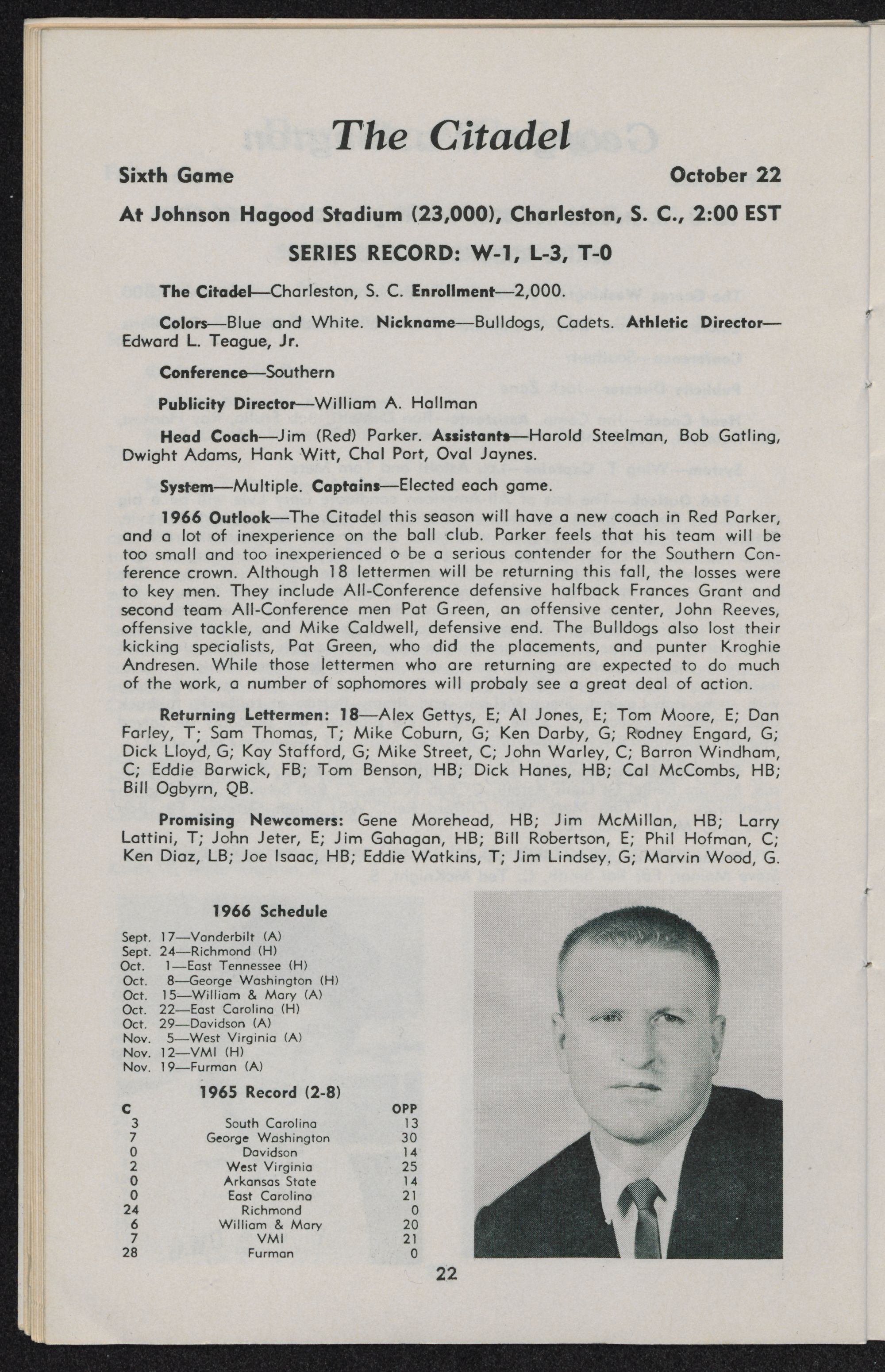 East Carolina 21, The Citadel 0 Oct. 23 Greenville, N. C. 13,800