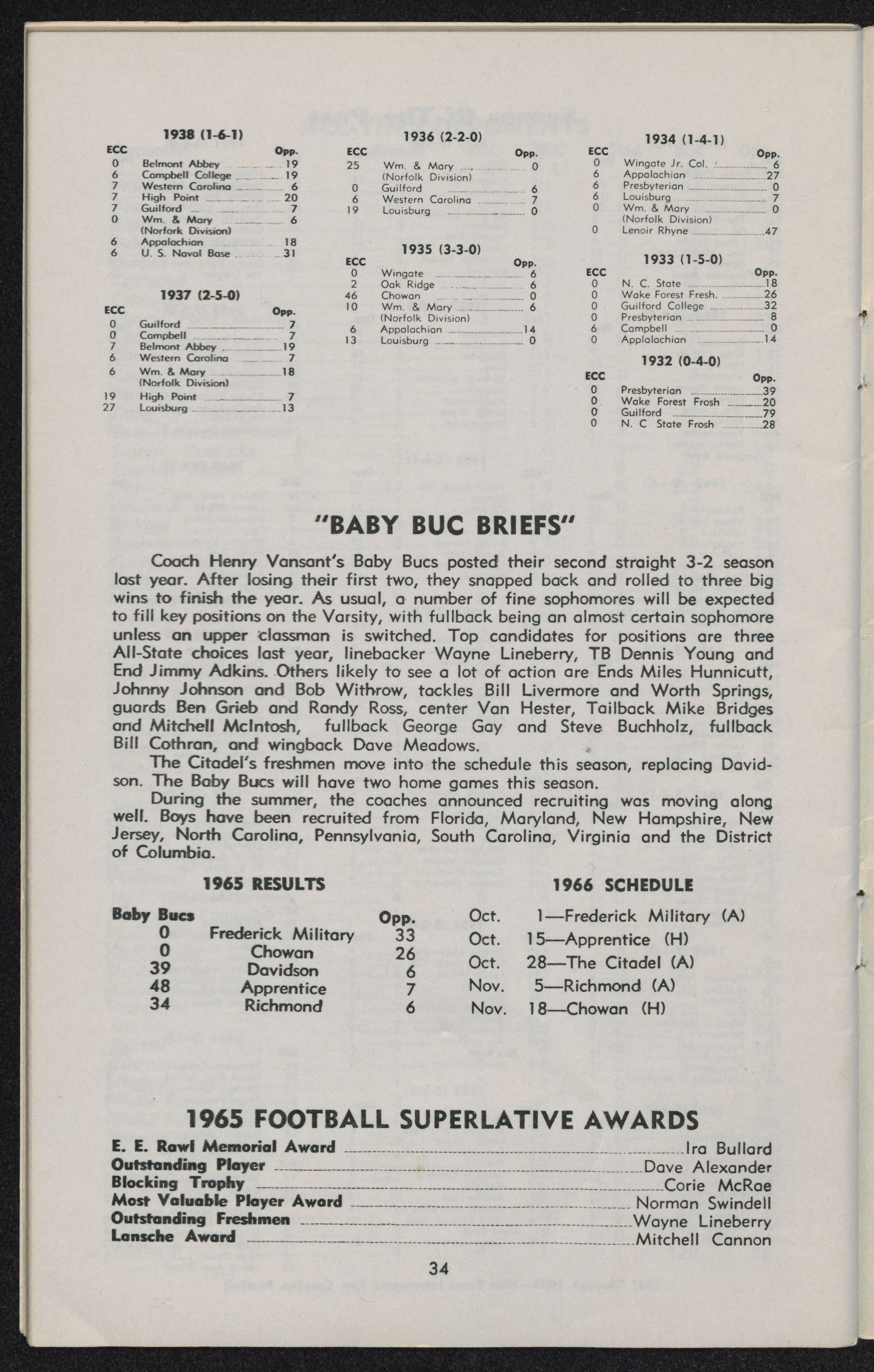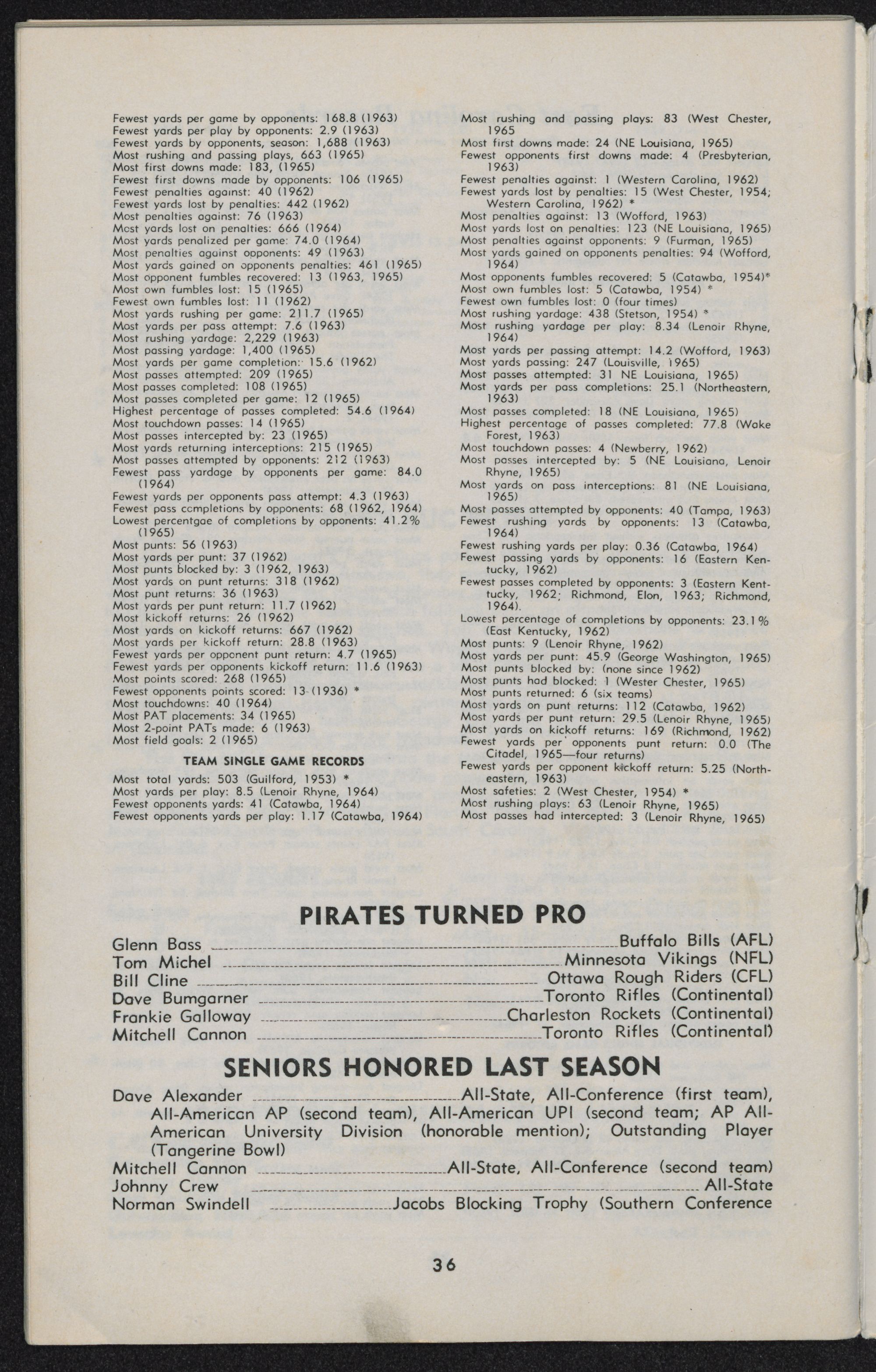 Fewest opponents yards: 41 (Catawba, 1964)