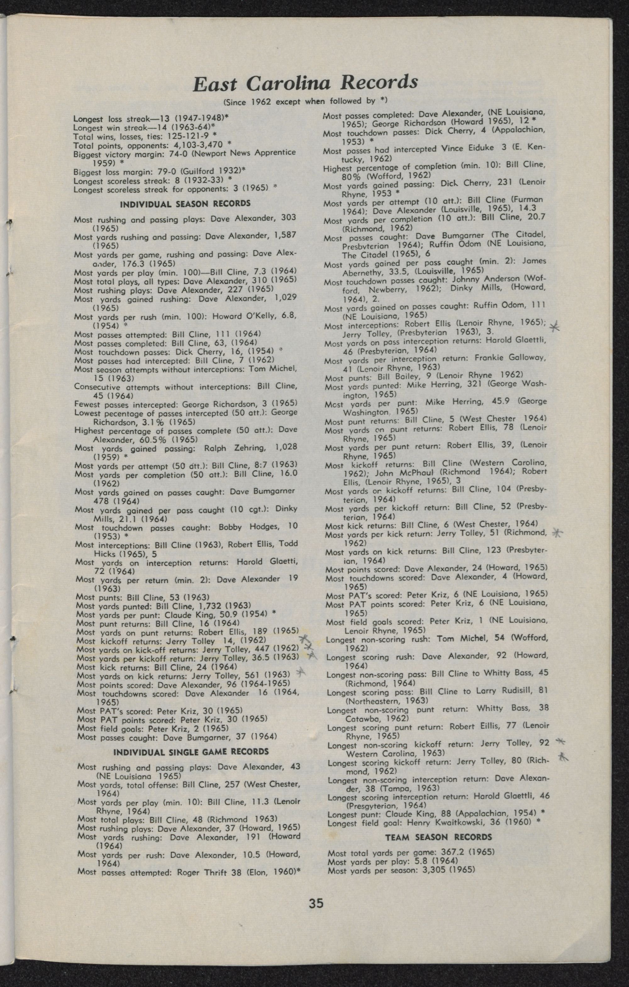 Fewest opponents yards per play: 1.17 (Catawba, 1964)