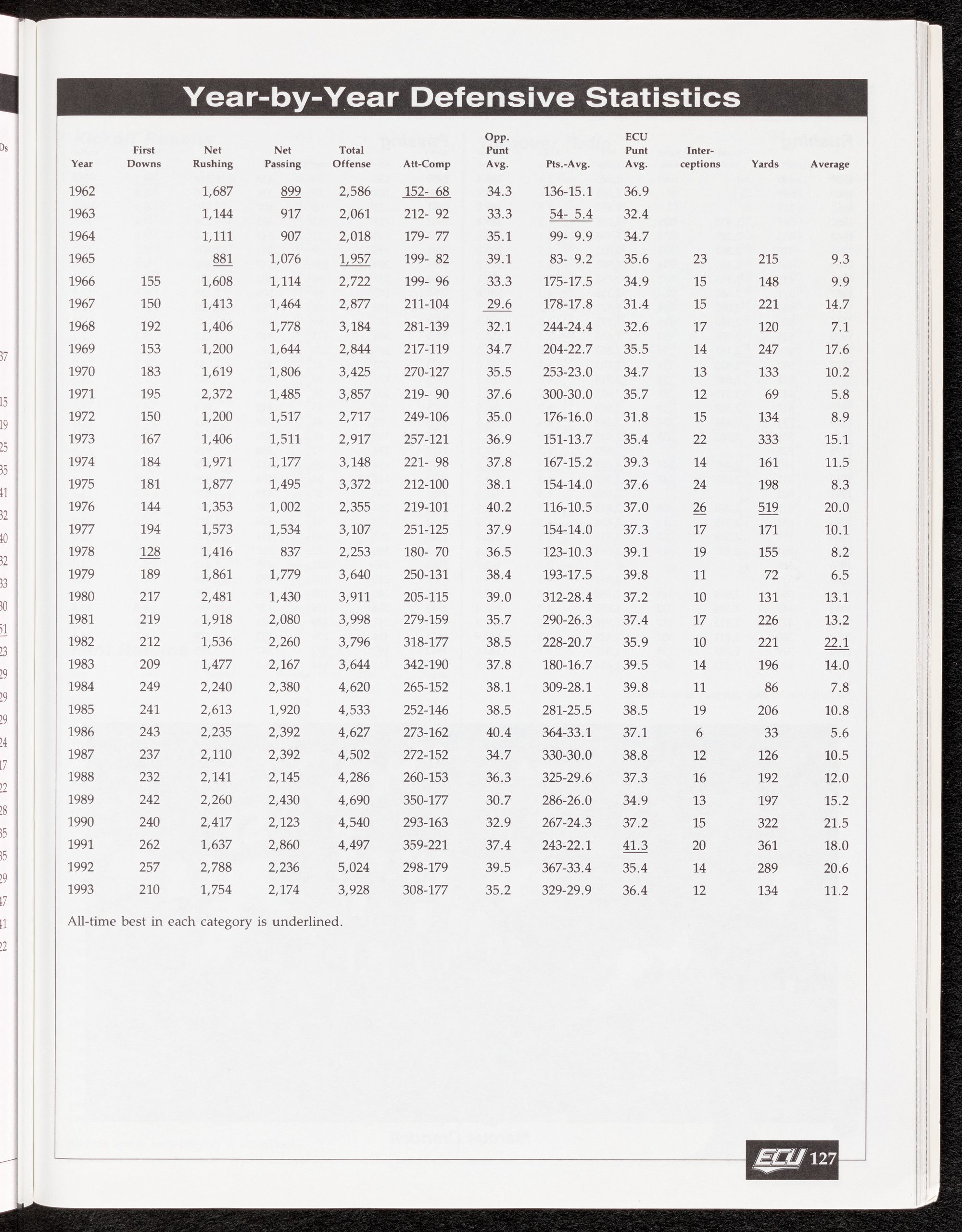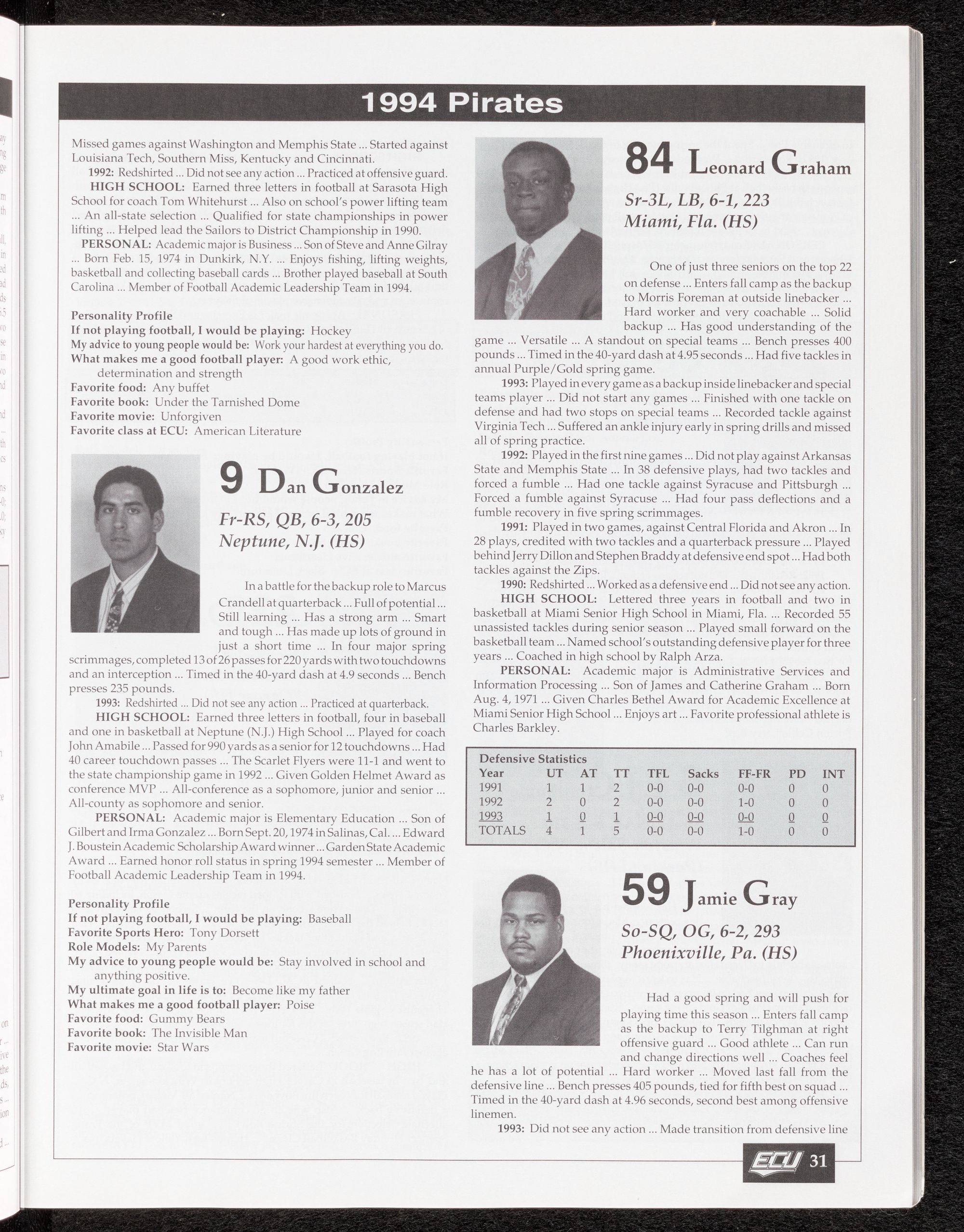 East Carolina University Football Media Guide for the 1994 season. Lists the roster, coaches, game schedule, and stats from the previous year.