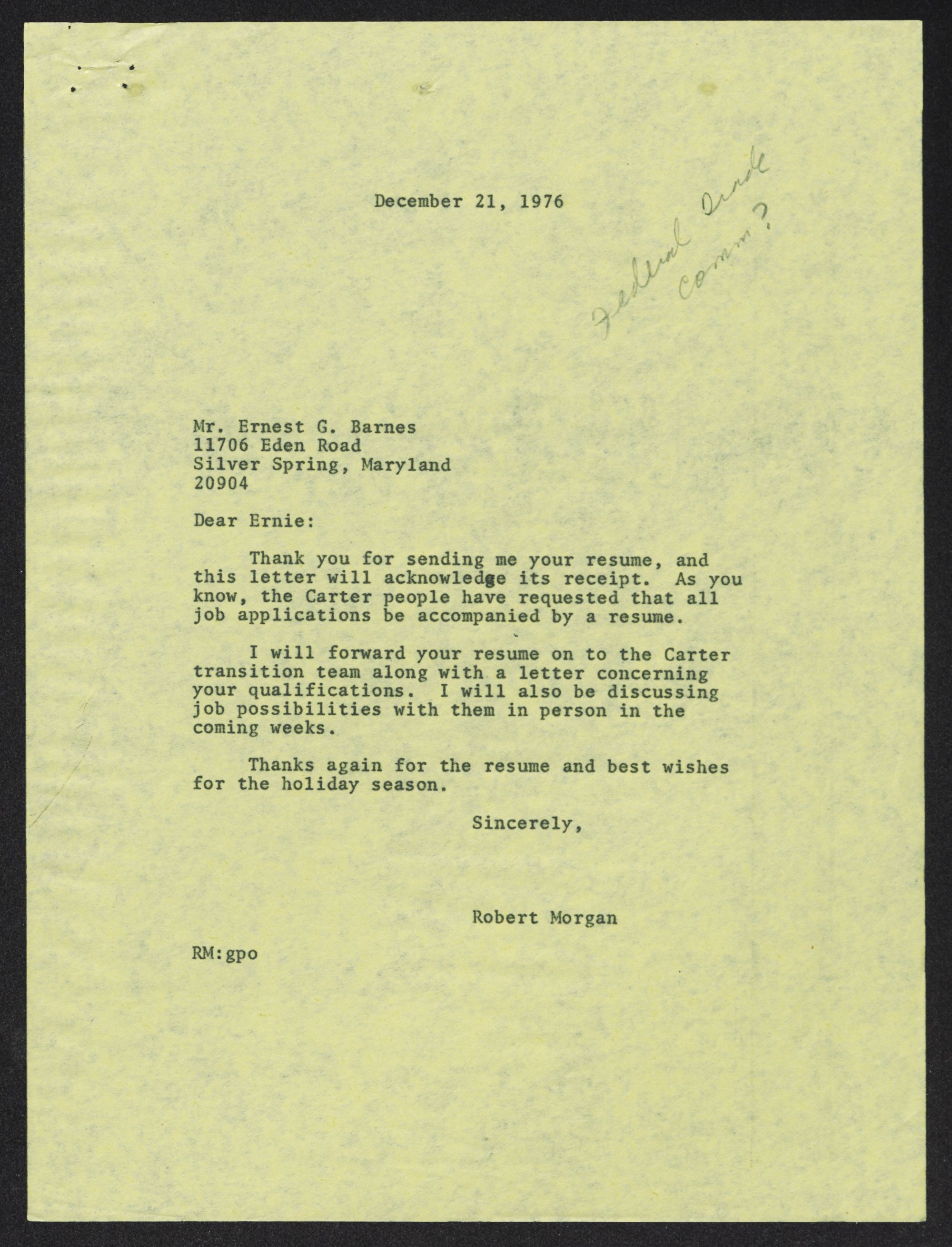 Correspondence pertaining to Judge Ernest G. Barnes and his nomination for appointment to the Federal Trade Commission. Creator: Ernest G. Barnes - December 21, 1976