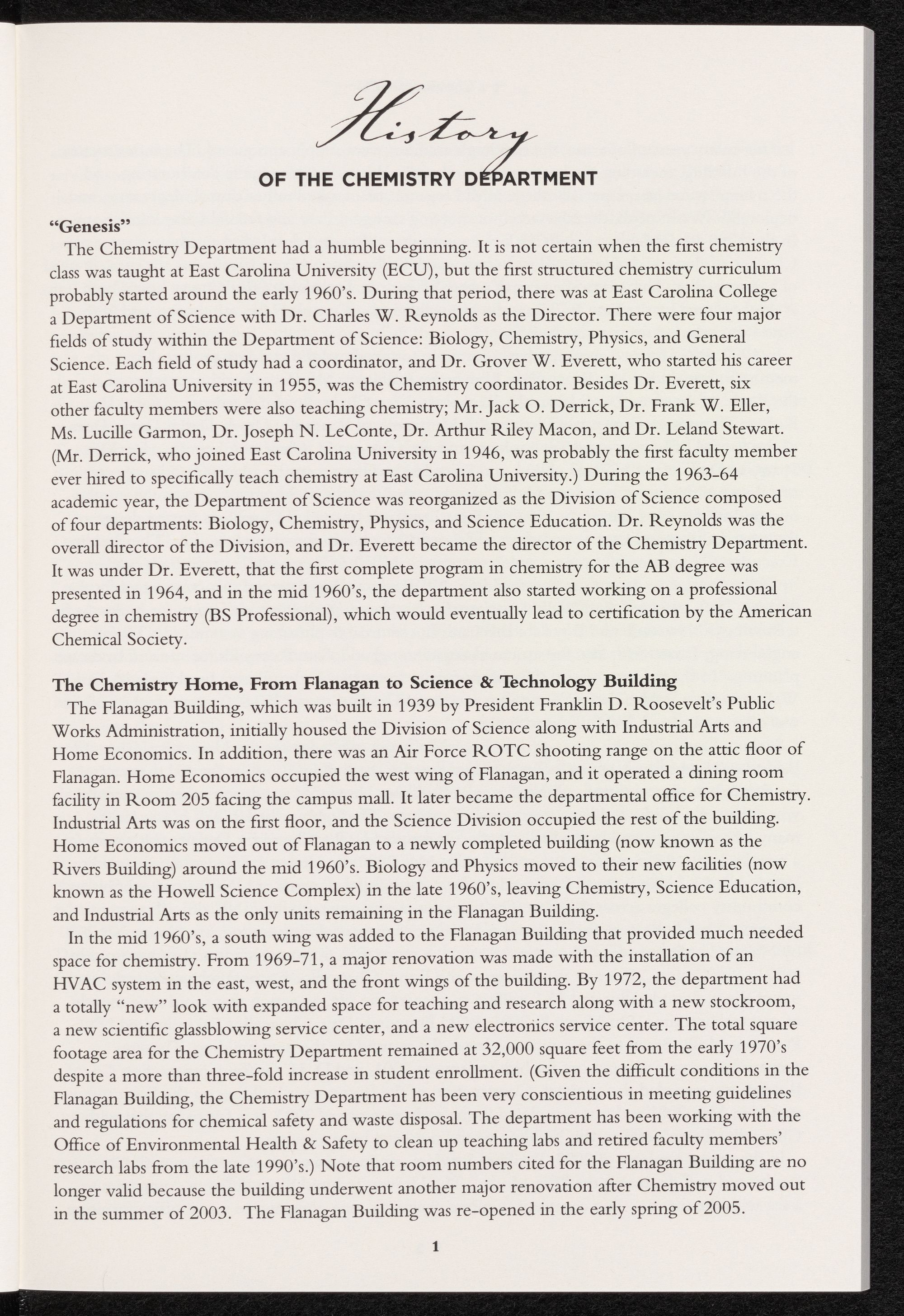 67 page booklet covering the history of the Department of Chemistry from 1965-2007. The booklet was created for the occasion of ECU's Centennial.