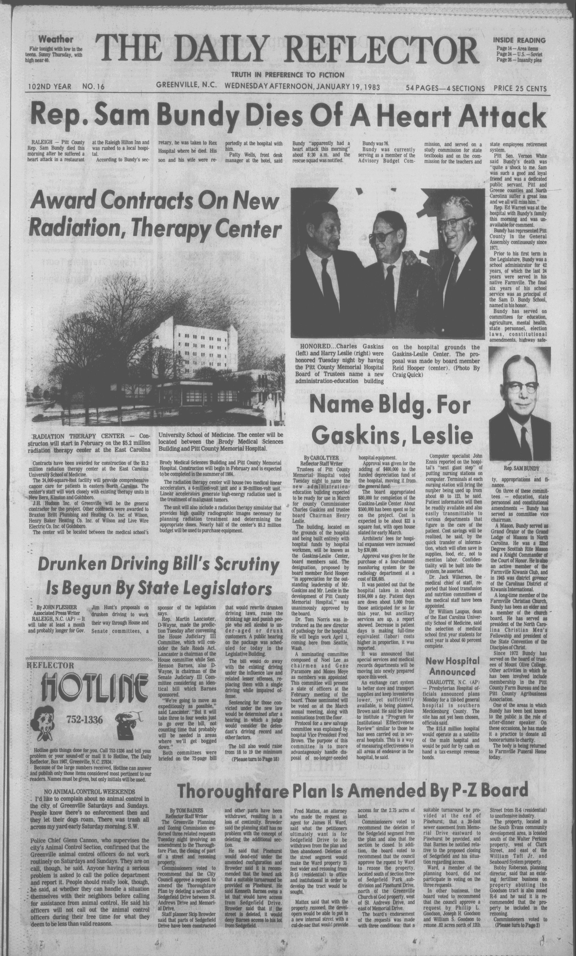 Pitt Si. Vernon White said Bundys death was quite a shock to me. Sam was such a good and ioyal friend and was a dedicated public servant. Pitt and Greene counties and North Carolina suffer a great loss and we all wUl miss him.