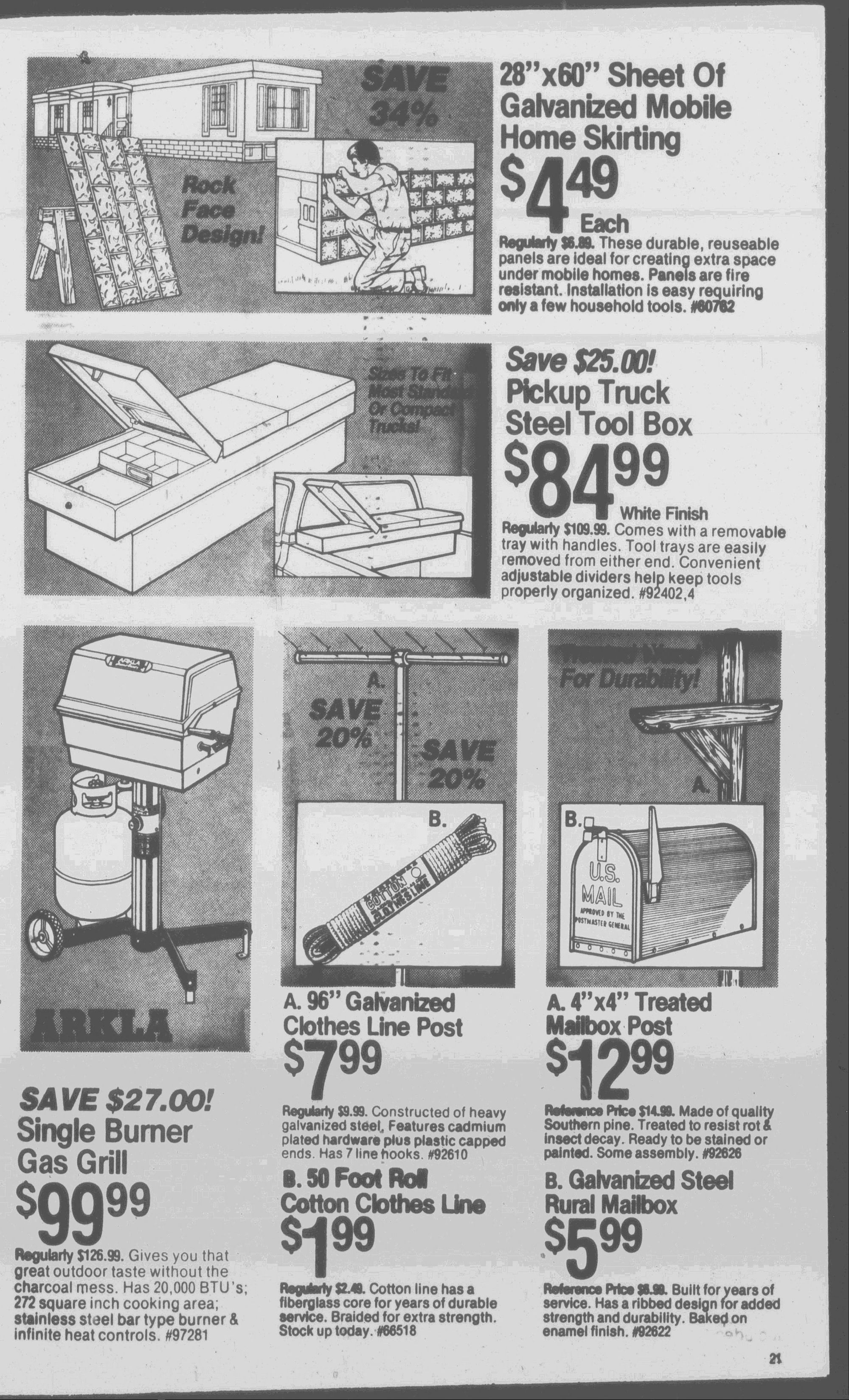Rsgularty $126.99. Gives you that great outdoor taste without the charcoal mess. Has 20,000 BTUs; 272 square inch cooking area; stainless steel bar type burner & infinite heat controls. #97281