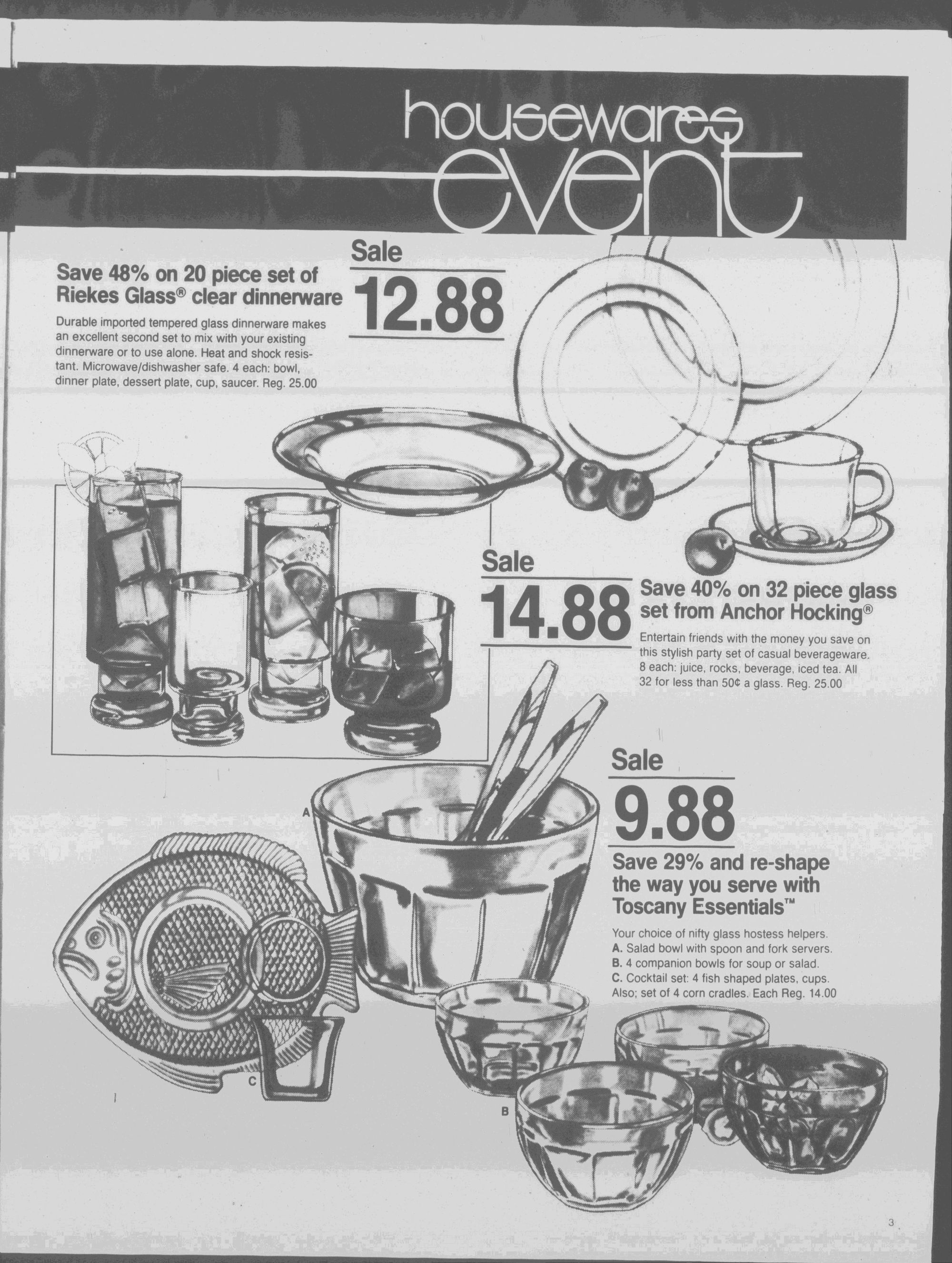 Durable imported tempered glass dinnerware makes an excellent second set to mix with your existing dinnerware or to use alone. Heat and shock resistant. Microwave/dishwasher safe. 4 each: bowl, dinner plate, dessert plate, cup, saucer. Reg. 25.00