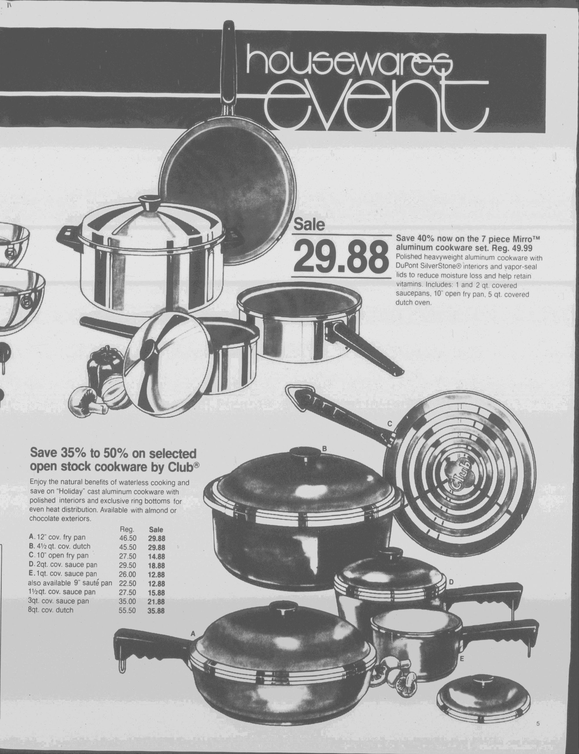 Polished heavyweight aluminum cookware with DuPont SilverStone Interiors and vapor-seal lids to reduce moisture loss and help retain vitamins. Includes: 1 and 2 qt. covered saucepans, 10" open fry pan, 5 qt. covered dutch oven.
