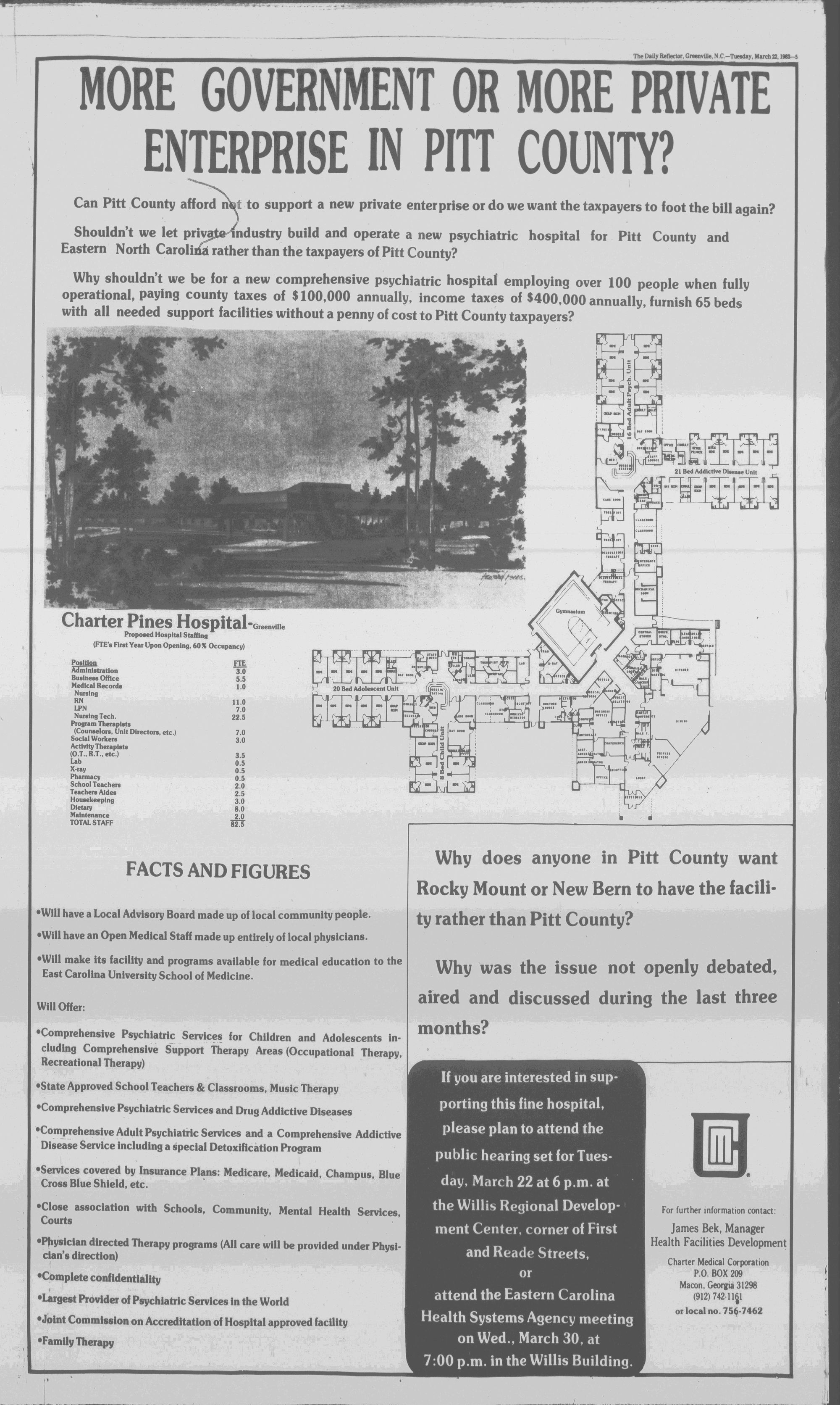 Bek said the privately developed hospital would add to and complement short-stay psychiatric services that are already offered here, rather than be in competition with existing medical facilities. He said Charter Pines Hospital would offer services for patient stays of 60 to 120 days or longer, which are not available at this time in Greenville.