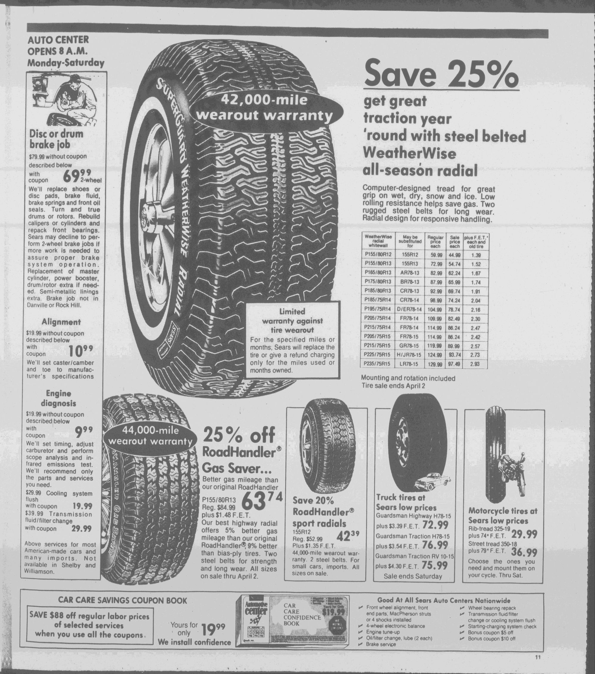 Reg. $52.99 Plus $1.35 F.E.T. 44,000-mile wearout warranty. 2 steel belts. For small cars, imports. All sizes on sale.
