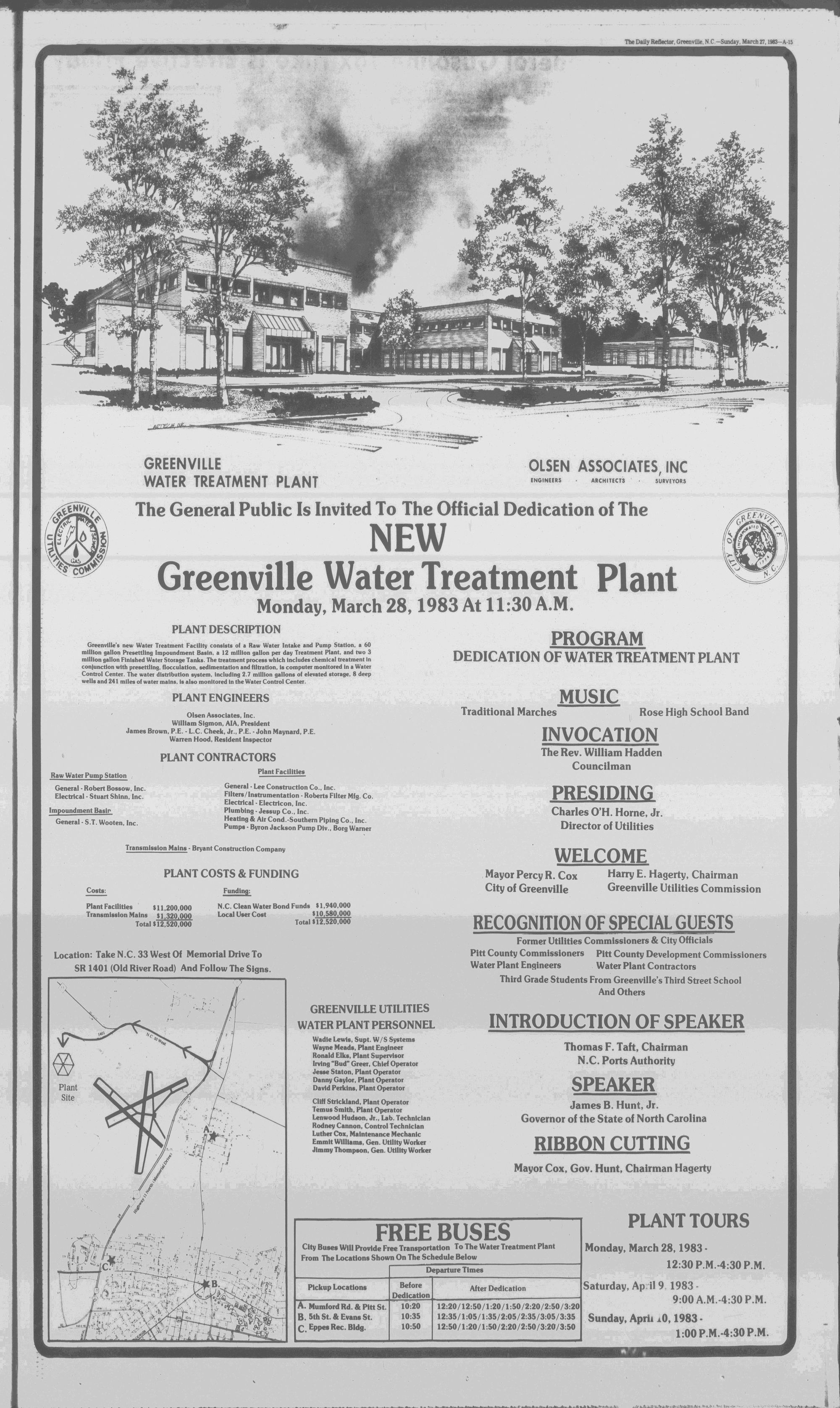 Gov. Jim Hunt will be the featured speaker at dedica-tion ceremonies for Greenvilles new $12.5 million water treatment plant at 11:30 a.m. Monday.