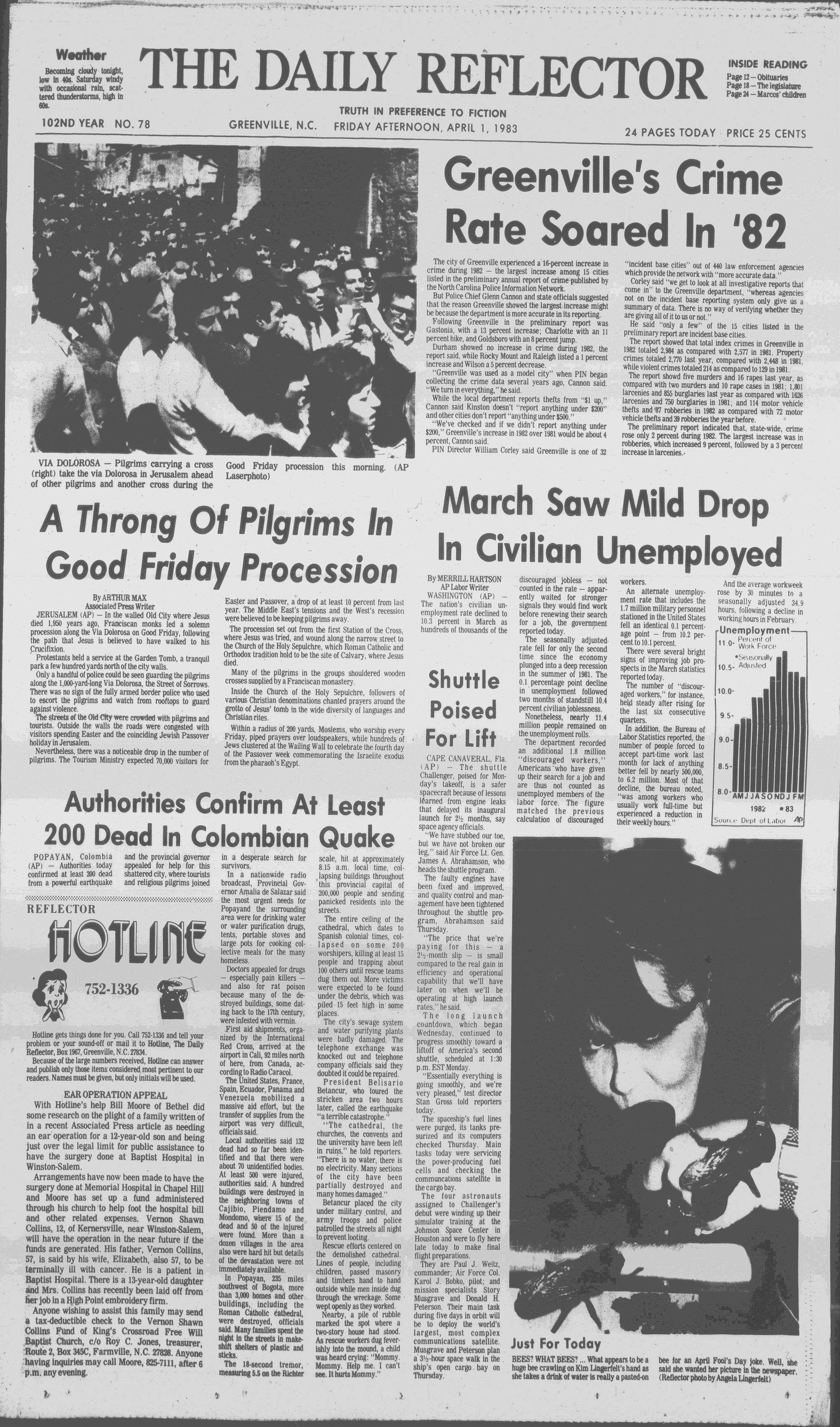 The report showed that total index crimes in GreenvUle in 19ffi totaled 2,984 as compared with 2,577 in 1981. Pn^rty crimes totaled 2,770 last year, compared with 2,448 in 1981, while violent crimes totaled 214 as compared to 129 in 1981.
