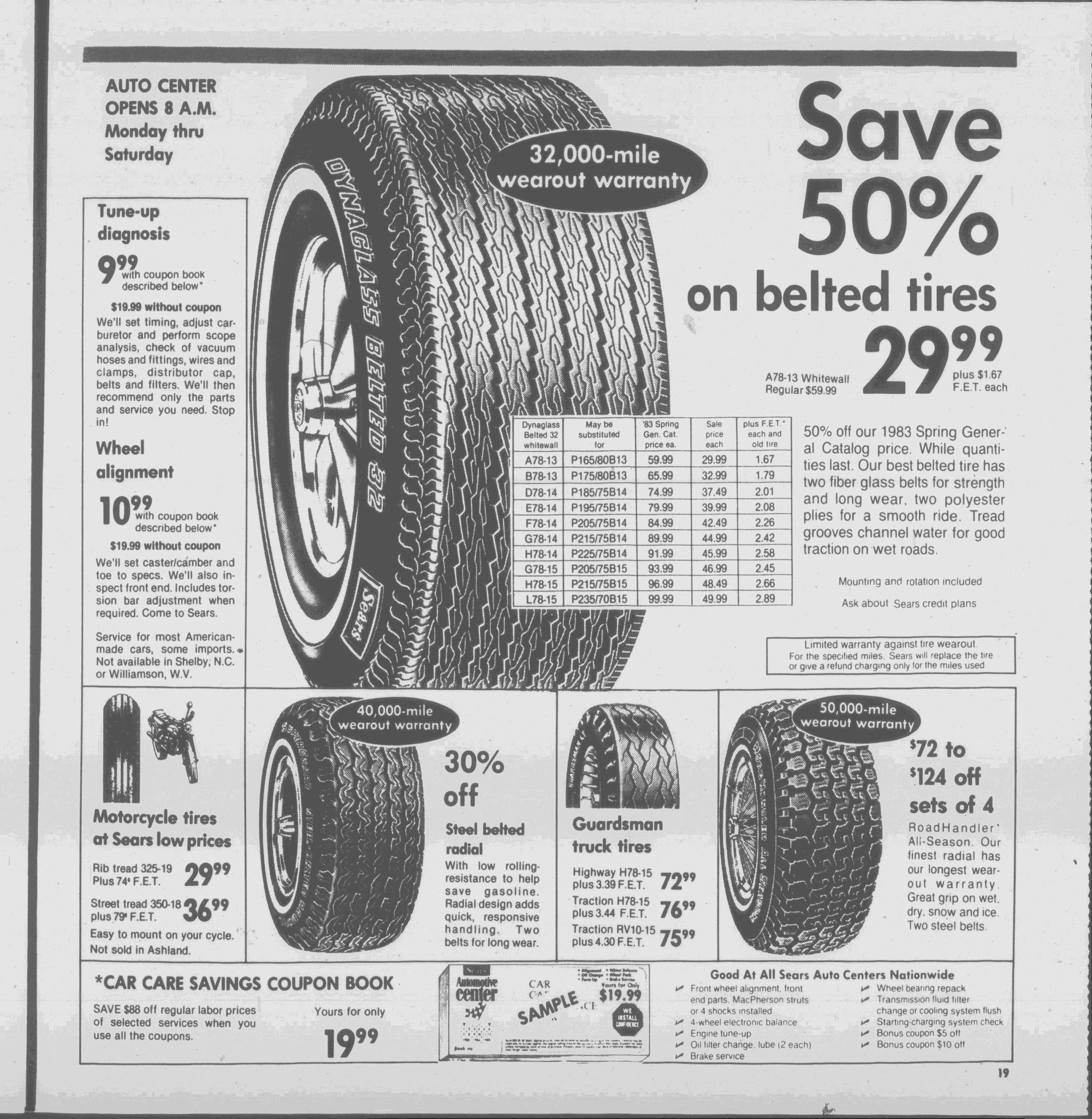 50% off our 1983 Spring General Catalog price. While quantities last. Our best belted tire has two fiber glass belts for strength and long wear, two polyester plies for a smooth ride. Tread grooves channel water for good traction on wet roads.