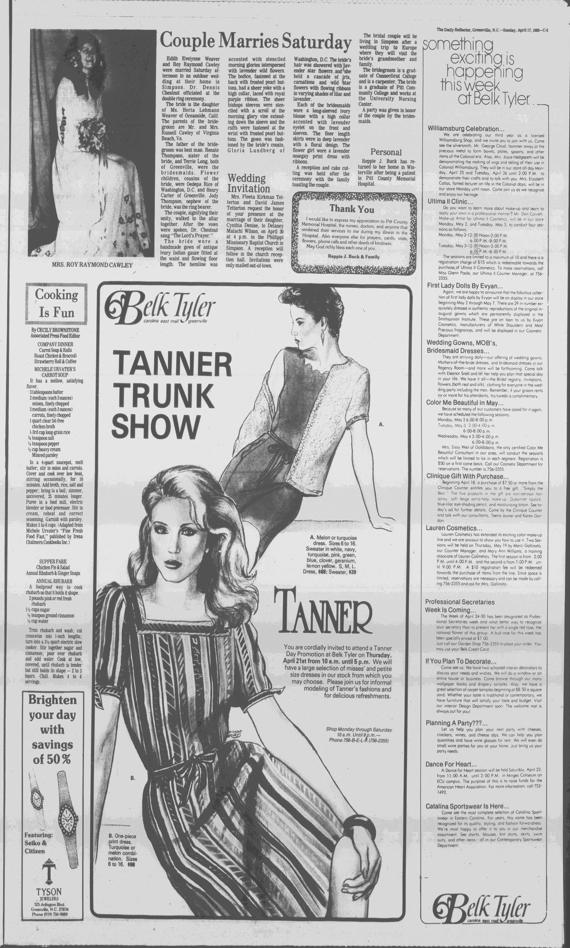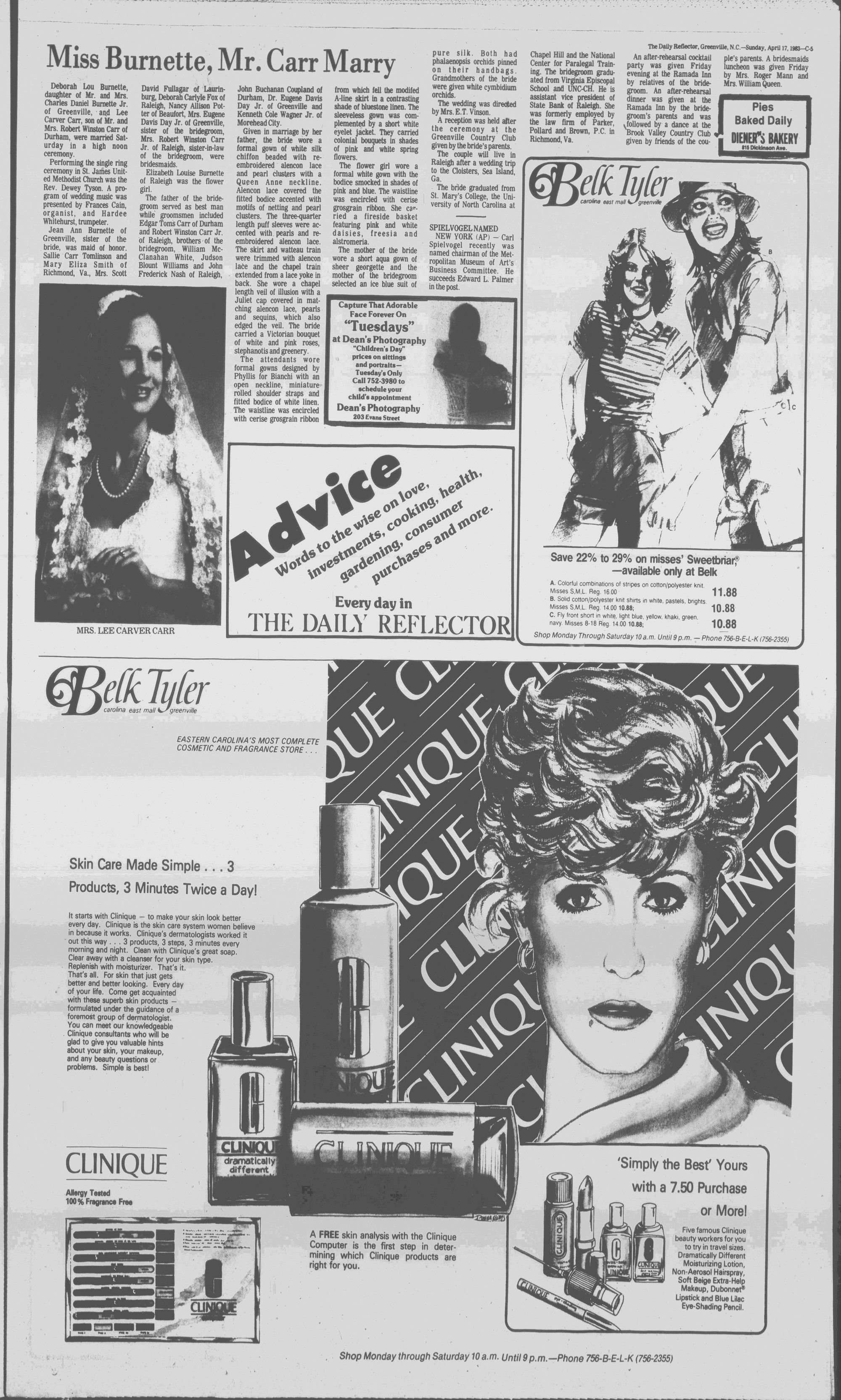 The newspaper was established in 1882, and was originally named the Eastern Reflector. It was founded by Julian Whichard and David Jordan with equipment they purchased from The Greenville Express. On December 10, 1894, it adopted the name The Reflector and began publishing every day. Cox Newspapers acquired The Daily Reflector in 1996. Creator: Daily Reflector (Greenville, N.C.)