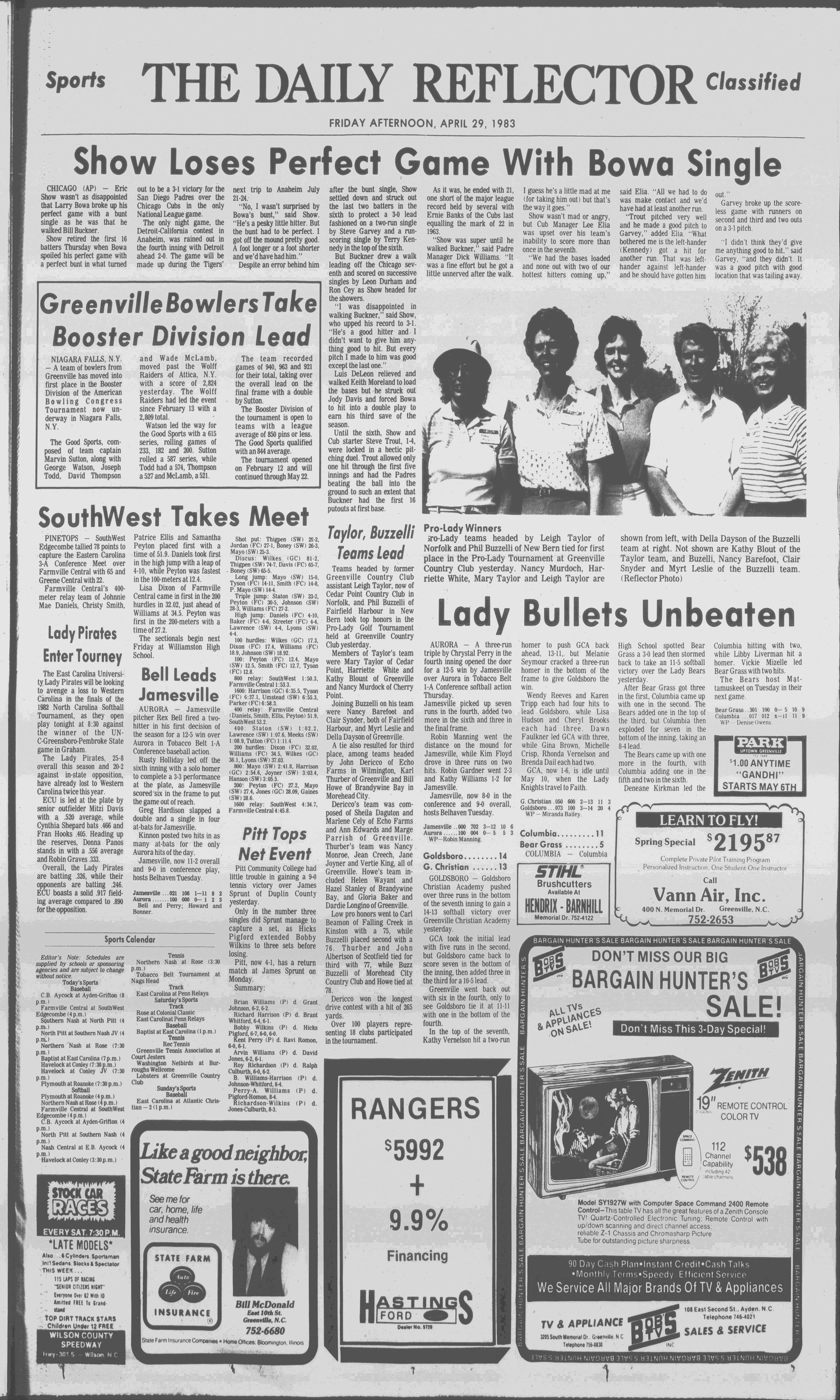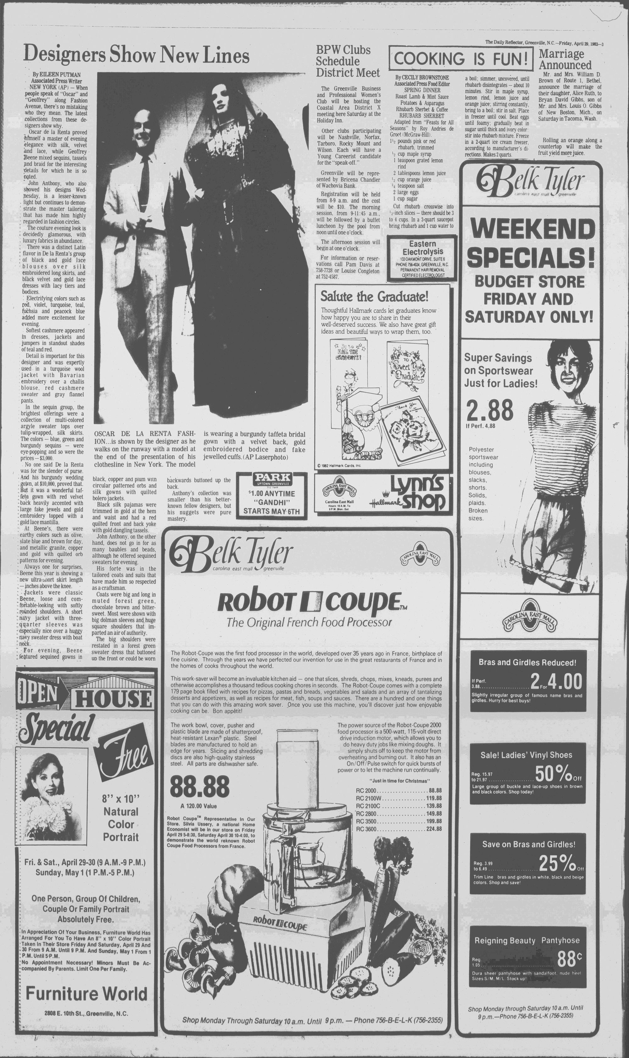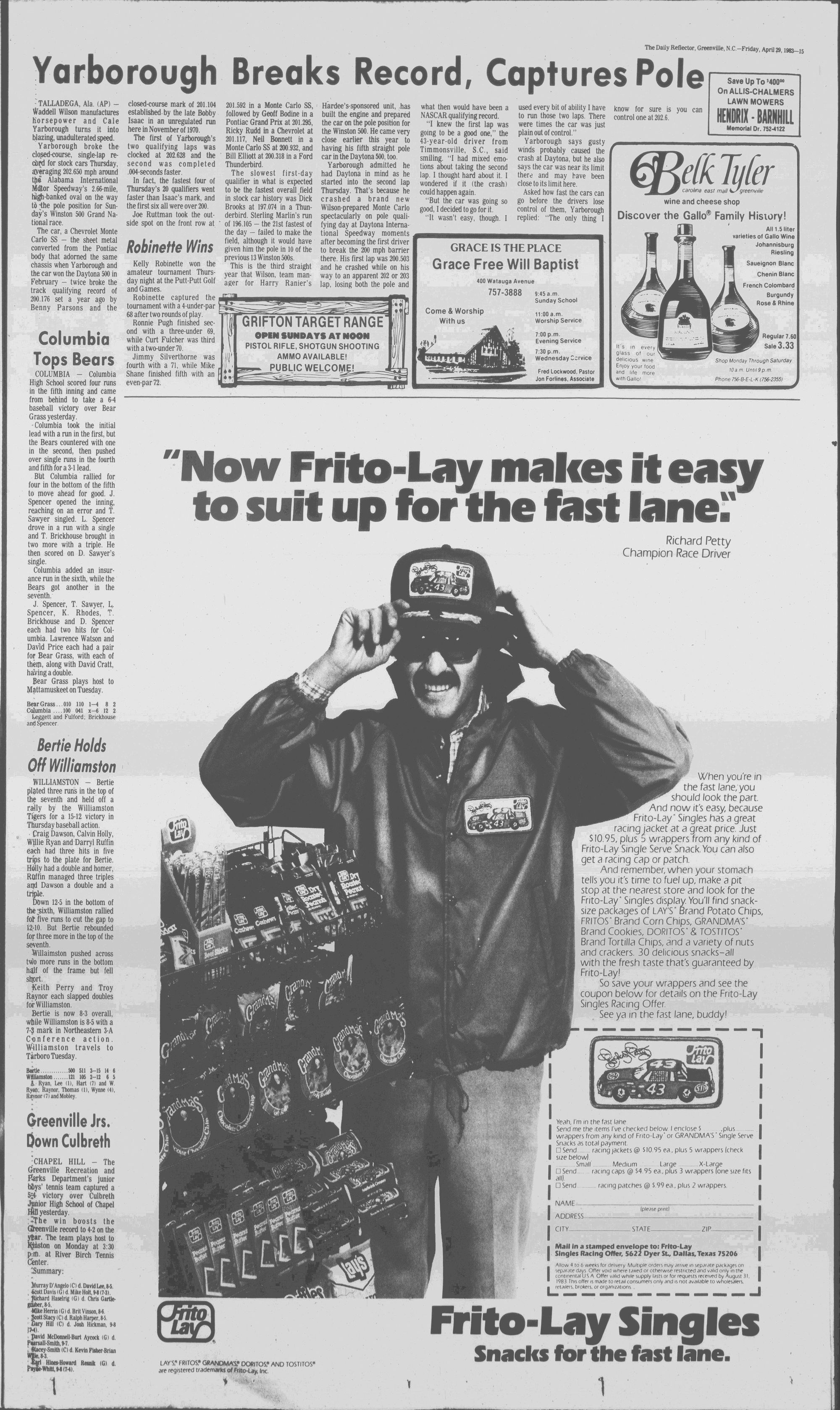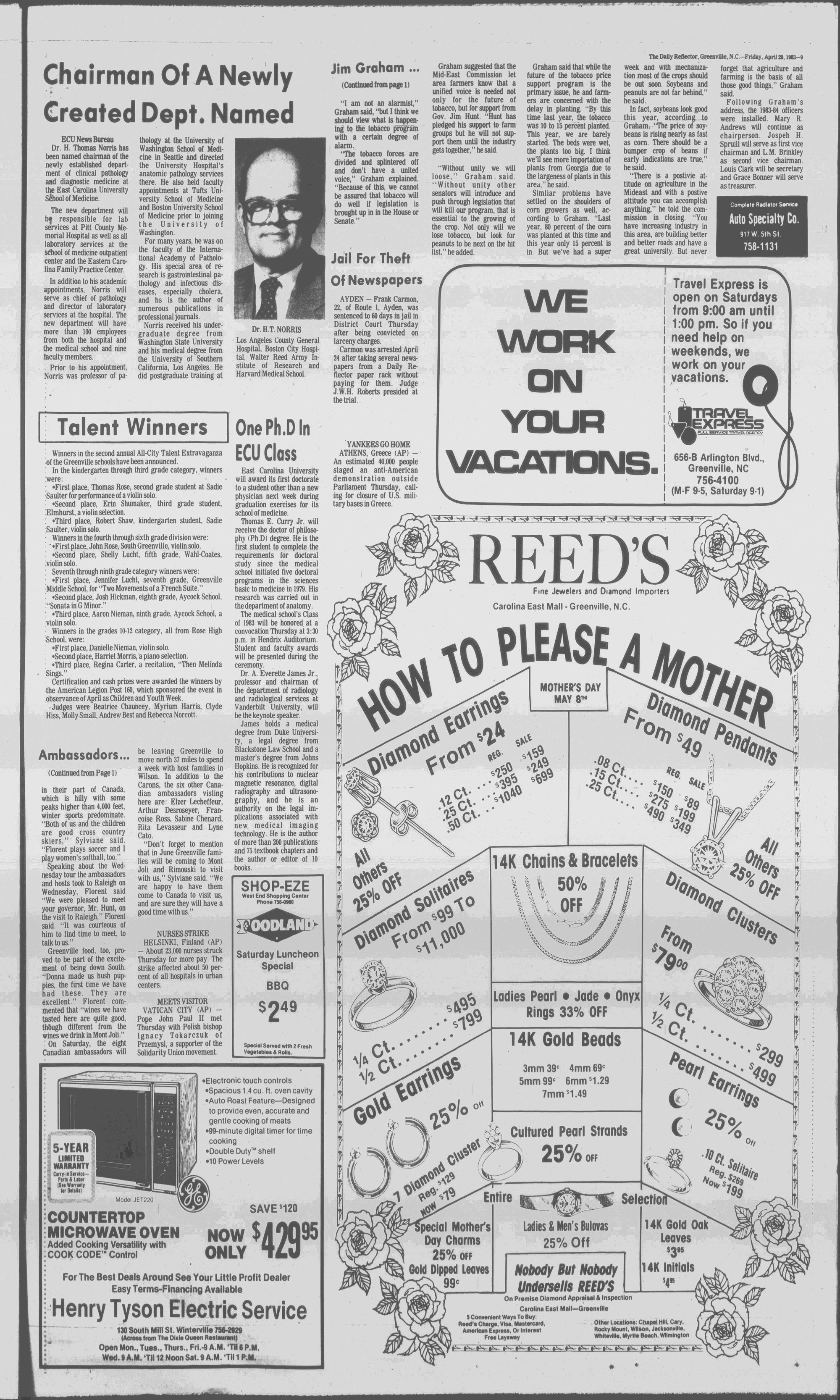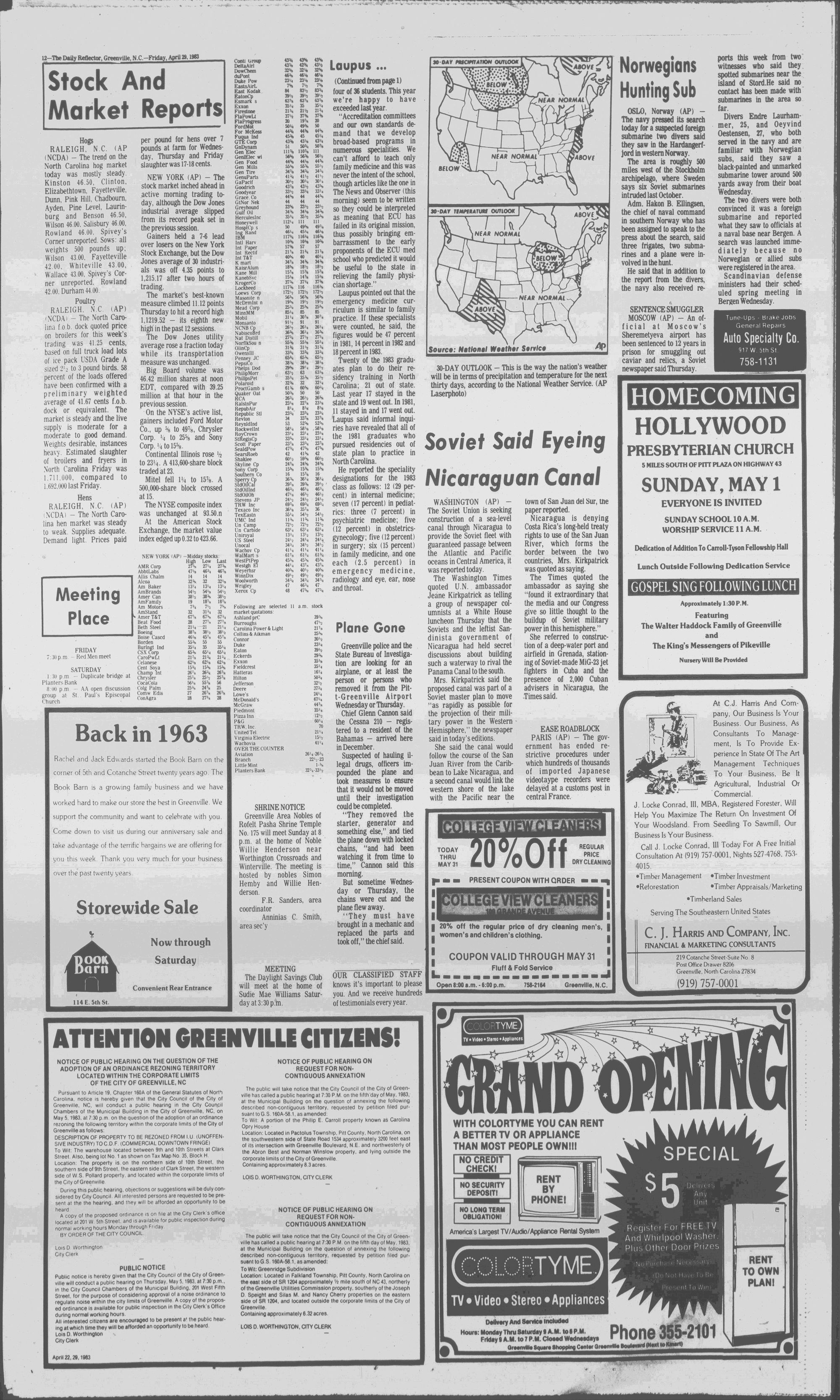 By JERRY RAYNOR Reflector Staff Writer For Florent and Sylviane Coron the relatively cool April weather when they arrived in Greenville last Saturday was very nice, warm to us. When we left Mont Joli there was still four and one-half feet of snow on the ground, Florent commented. The warm day yesterday (Wednesday) was the same as our warmest days in July and August.