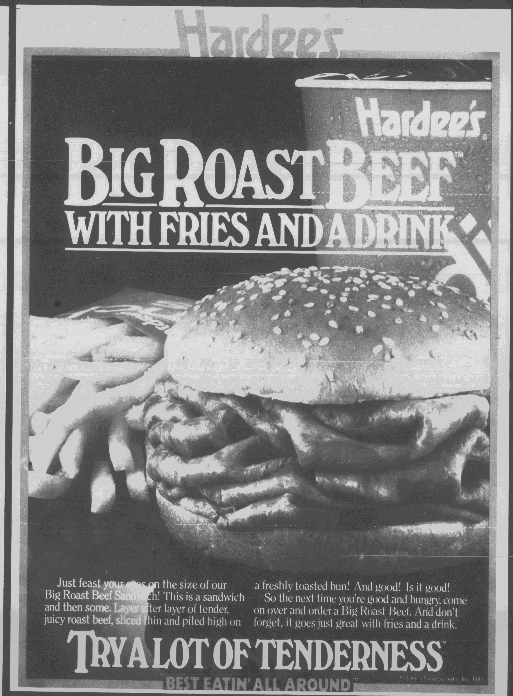 Big Roast BeefSIjl^P^- T his is a sandwich So ttie next time youre g(X)d and hungry come and then some. L^Wer layer of tender, c >n over and order a t^ig t^oast l^eef. And dont juicy roast beef, slici||piin and piled high on forget, it goes just great with fries and a drinkIterALOTOFTENDERNESS
