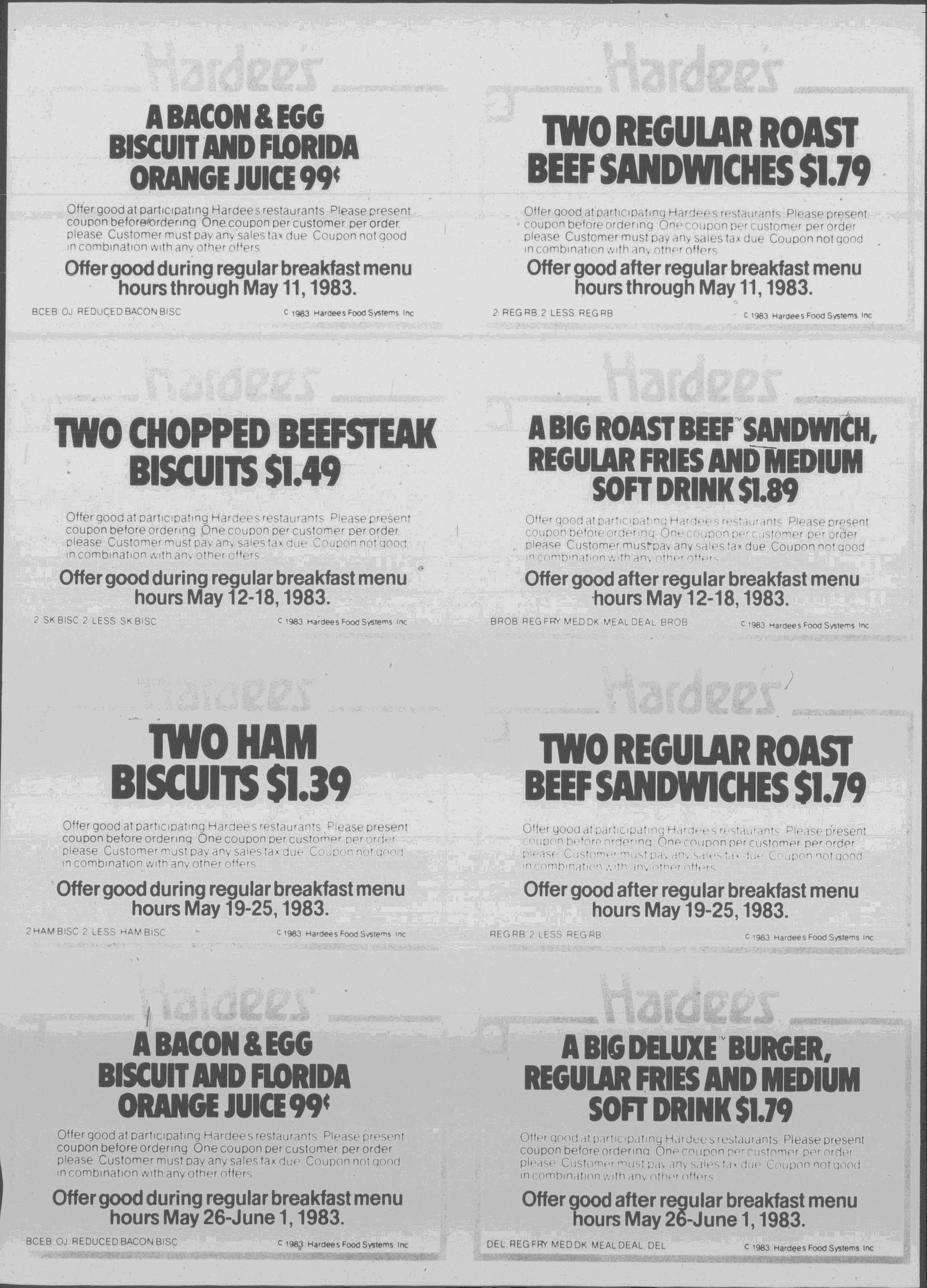 Offer good at participating Hardees restaurants Please present coupon beforeiordering Onecoupon per customer per order, please Customer must pay any sales tax due Coupon not good m combination with any other of'ersOffer good during regular breakfast menu hours through May 11,1983.IWOREGUUUtRQACT BEEFSAIIDmCHES$L79