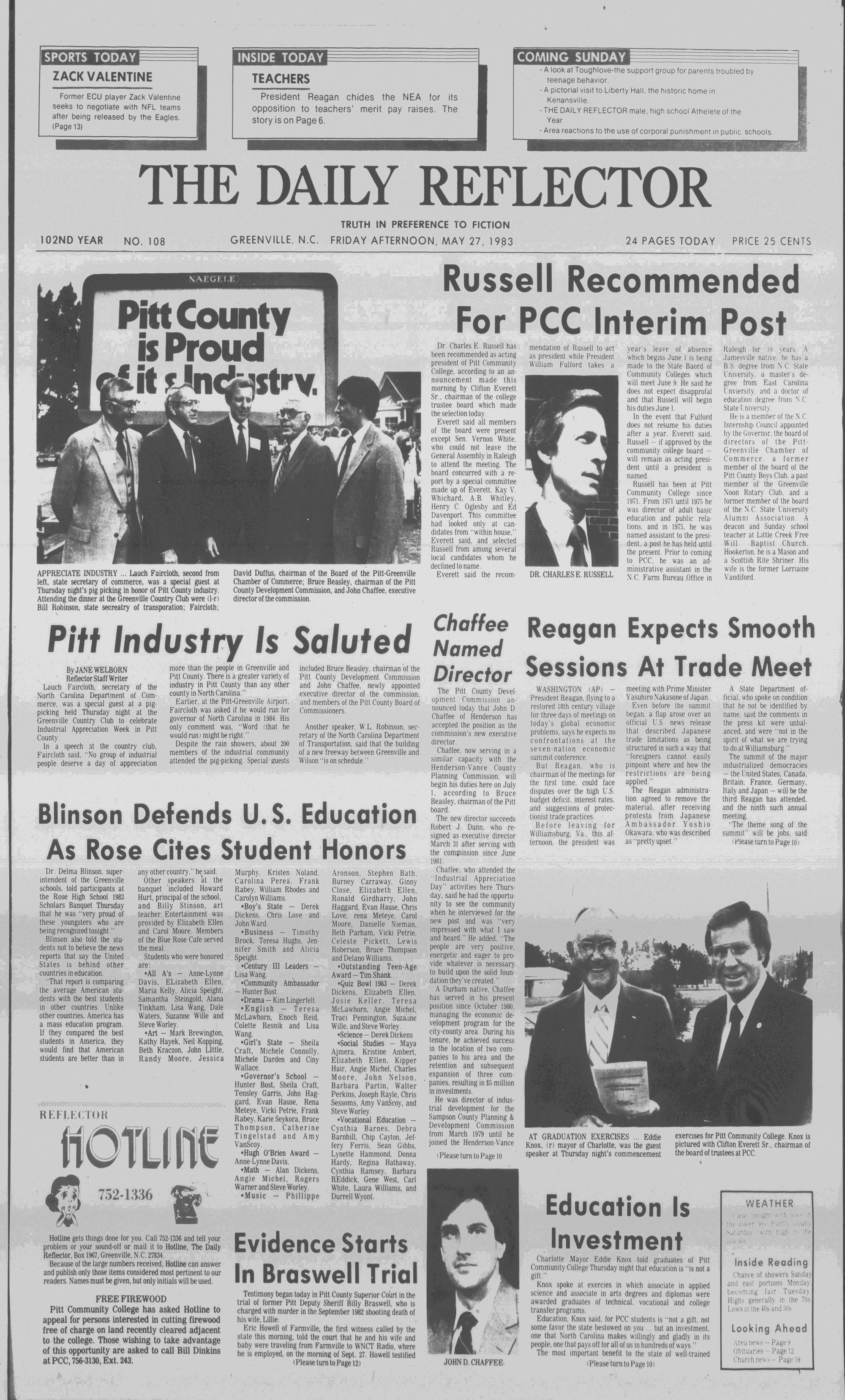 Russell has been at Pitt Community College since 1971. From 1971 until 1975 he was director of adult basic education and public relations, and in 1975. he was named assistant to the president, a post he has held until the present. Prior to coming to PCC, he was an administrative assistant in the N.C. Farm Bureau Office in