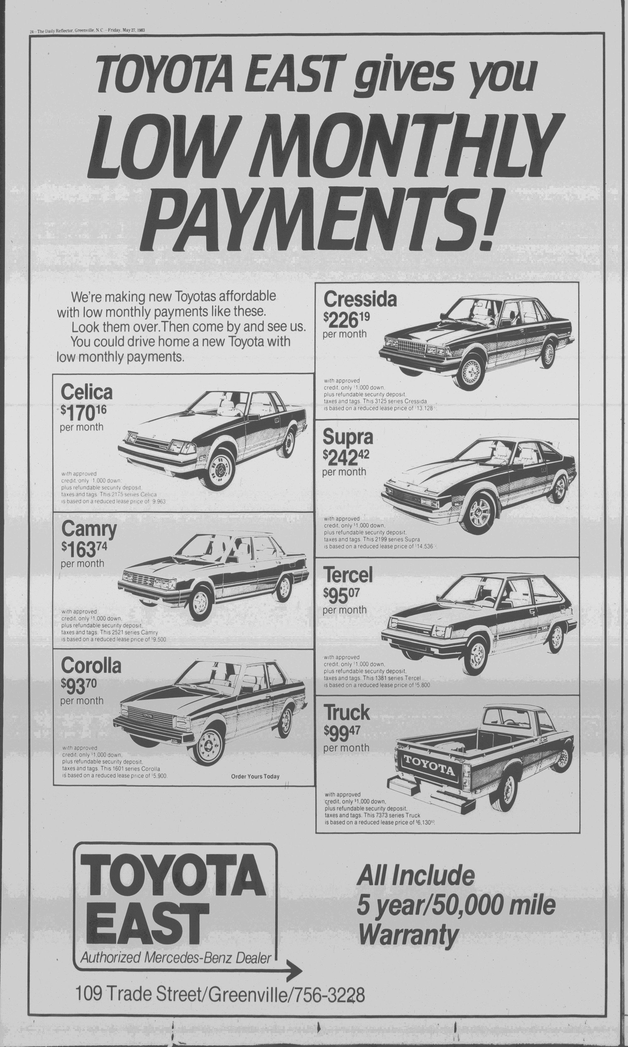 Look them over.Then come by and see us, You could drive home a new Toyota with low monthly payments.