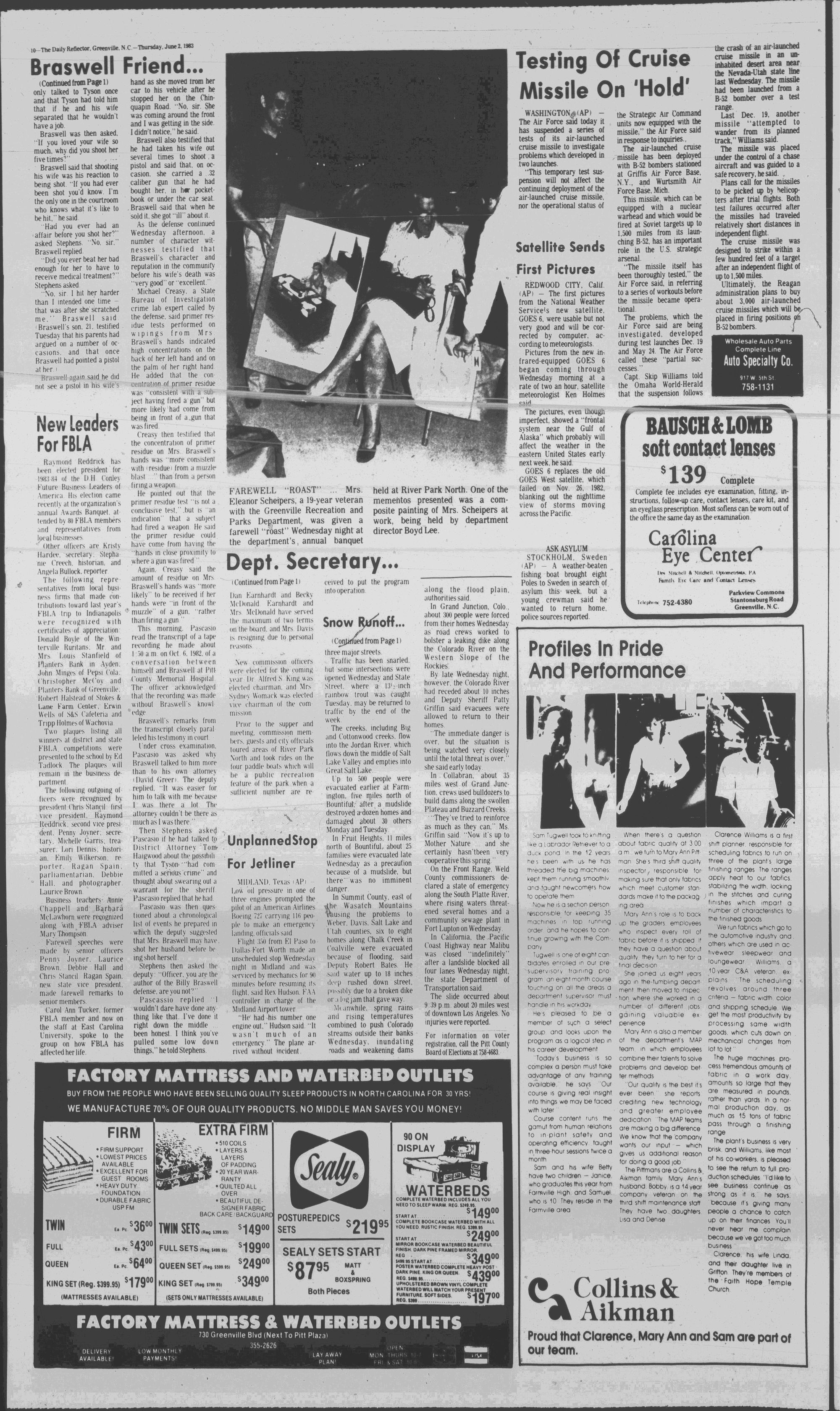 death of his wife, Lilbe Witnesses Friday and Tuesday told of how Mrs Braswell was shot four times and her body found on tbe ground behind her car at the intersection of U.S 364A and Chinguapin Road near Farmvilie Braswell was found later at his FarmviUe home with two bullet wounds in his chest Other witnesses testified that the weapon which killed Mrs Braswell was found on the front seat of Braswells patrol car parked at his home, and that aixkher pistol was found mi the den floor inside the house Braswell, bo took the witness stand in tis own behalf Wednesday mommg. said he shot his wife after she first shot him m the chest Braswell was T7 years old when he married in 1968. Mrs Braswell was 16, he said
