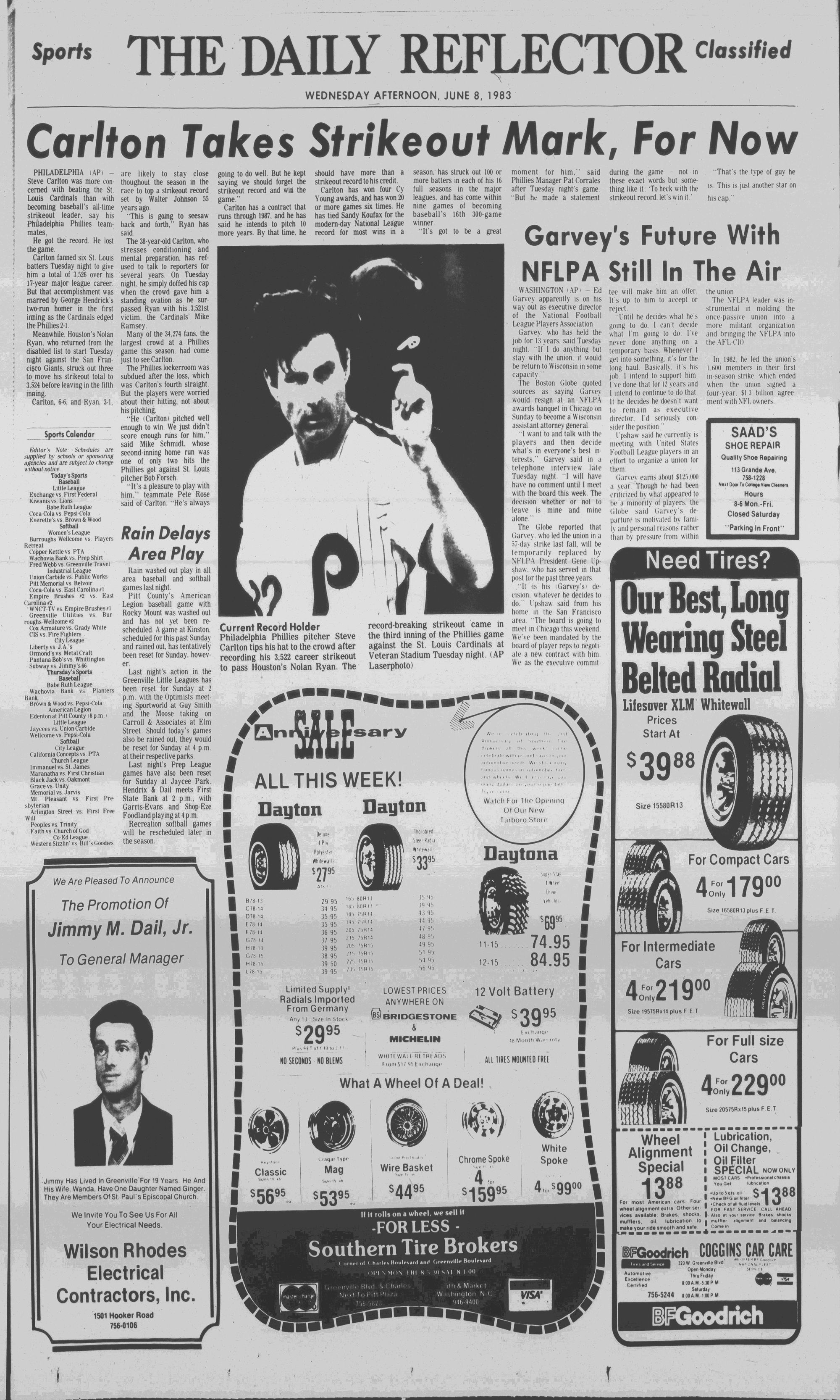 Steve Carlton inched ahead of Nolan Ryan in the strikeout king battle last night. (Page 21)