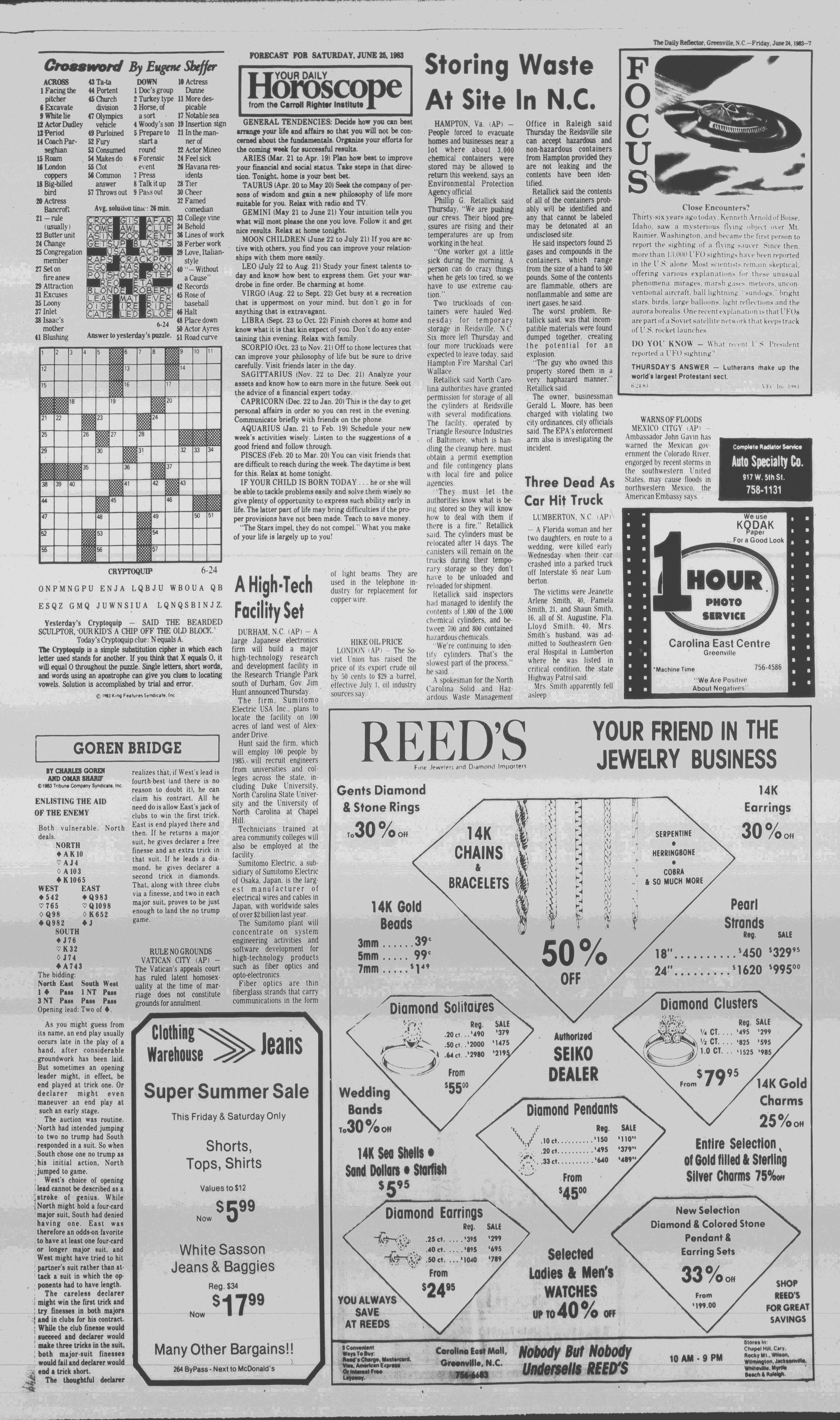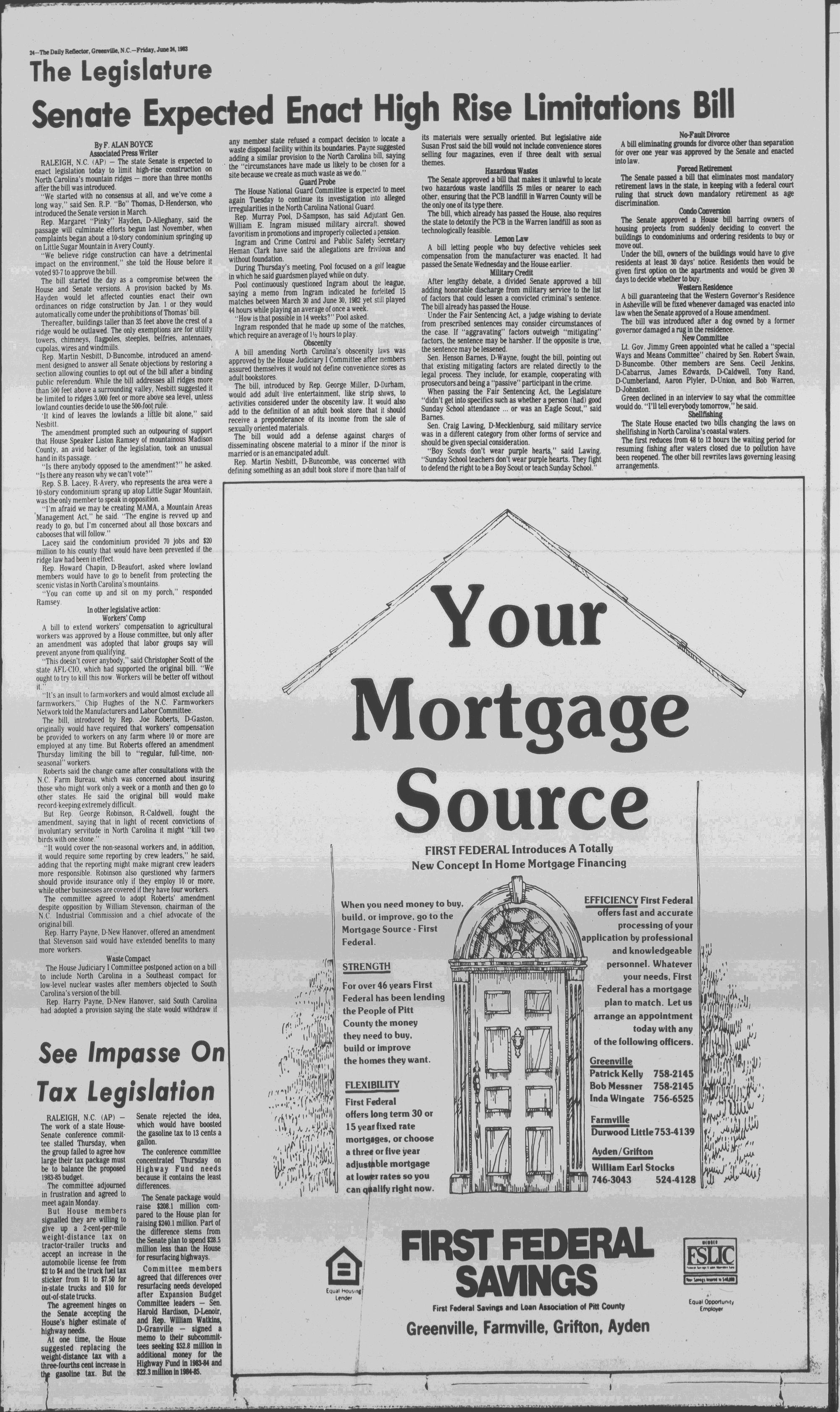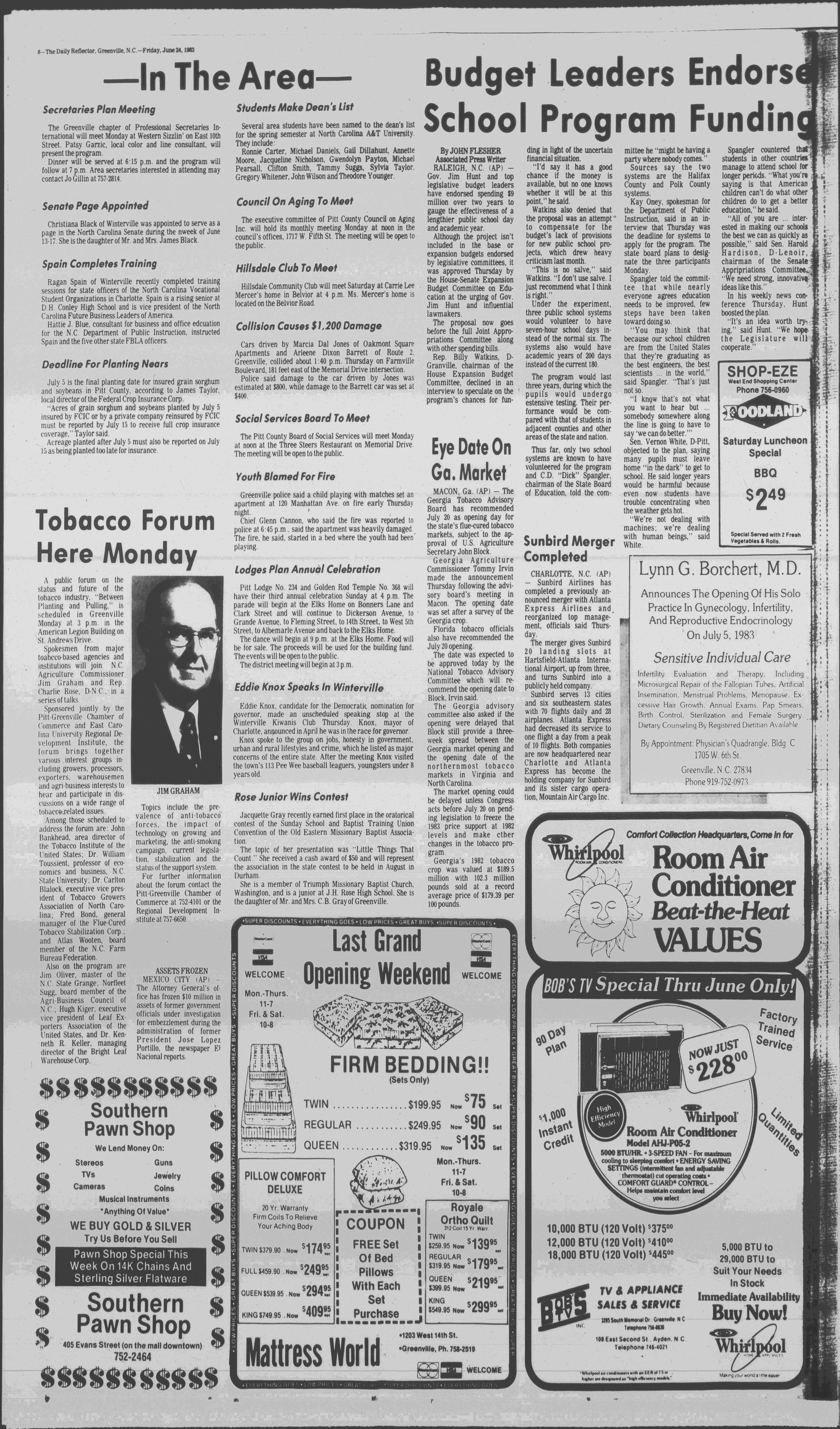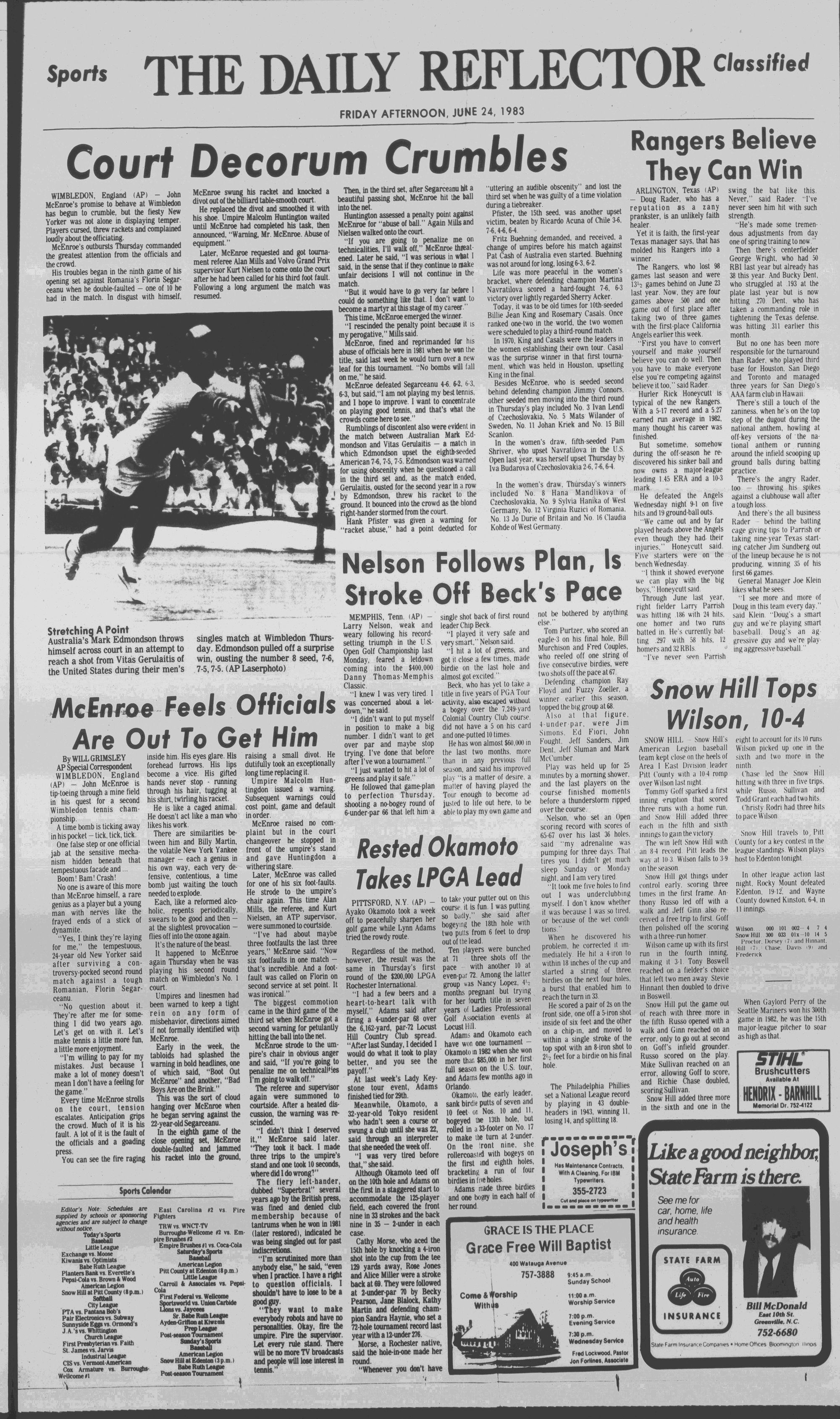 Tempers flared, curses were muttered and racquets flew as court decorum crumbled at Wimbledon yesterday. (Page 13)THE LiOISLATUREN.C. Senate expected to enact limitations on high rise conetruction on mountain ridges today, just 3 months after its introduction. (Page 24) City Council candidates preview their plans for the November elections. A pictorial look at the demolition of the former First Presbyterian Church. Pitt County schools wrap up Project Exodus. a program for GT students.THE DAILY REFLECTOR