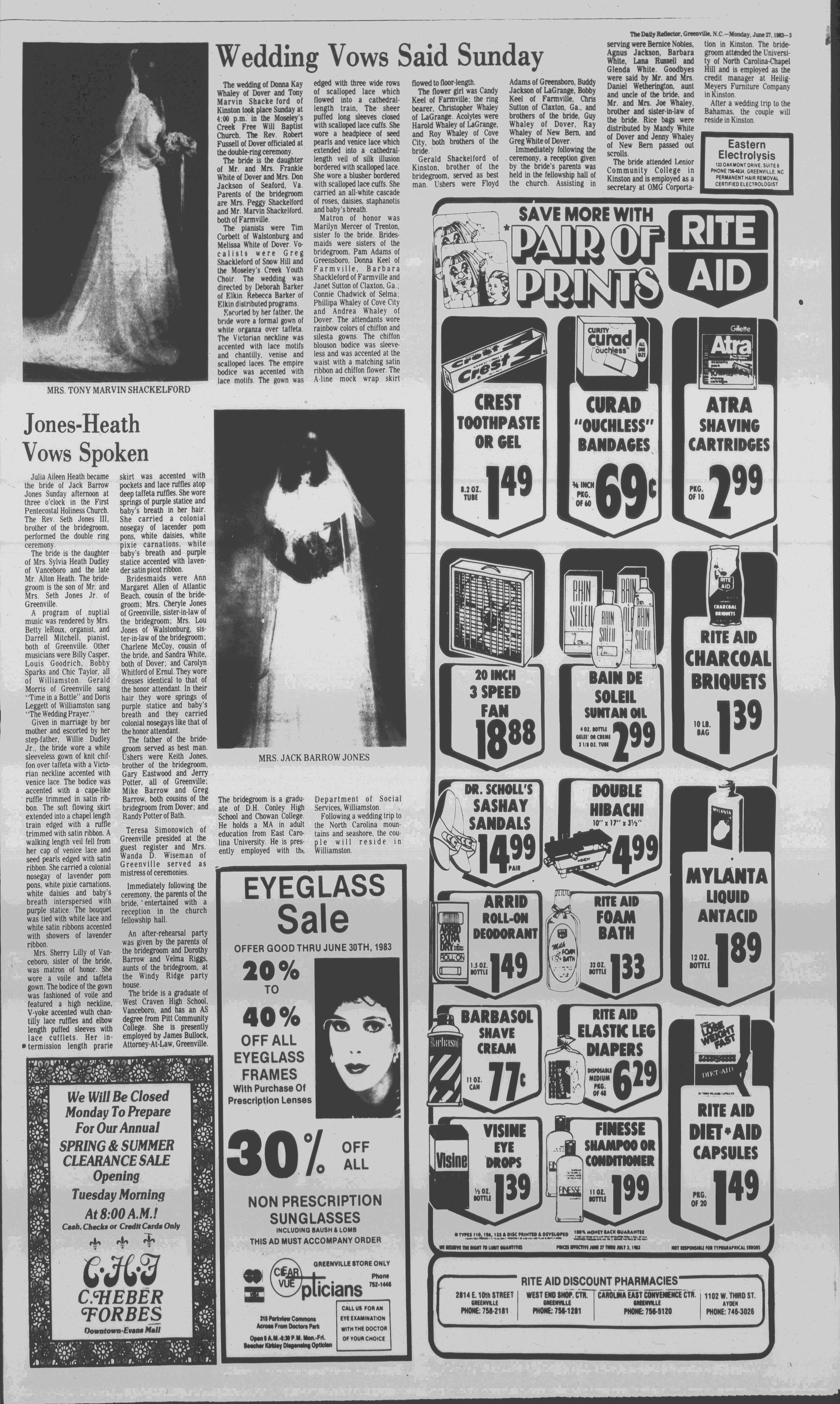 Julia Aileen Heath became the bride of Jack Barrow Jones Sunday afternoon at three oclock in the First Pentecostal Holiness Church. The Rev. Seth Jones III, brother of the bridegroom, performed the double ring ceremony.