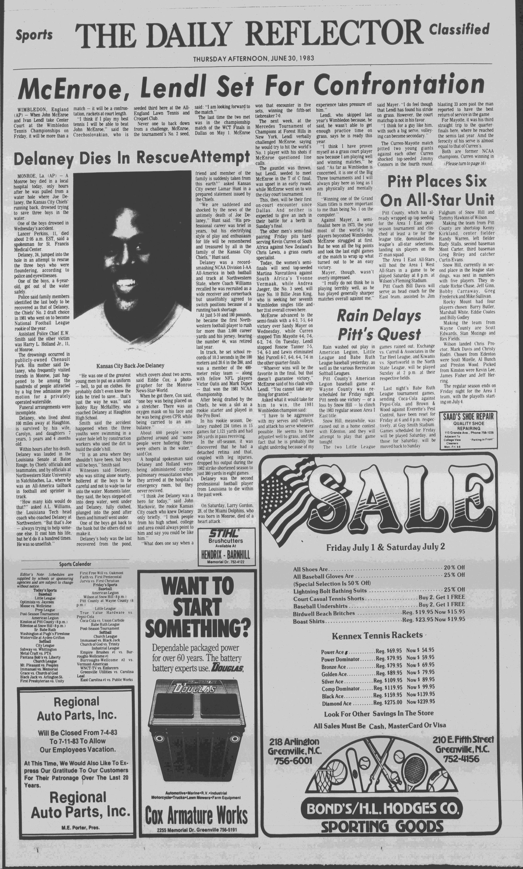 SPORTS TRAOEDYKansas City running back Joe Delaney died in a vain attempt to rescue two drowning youths yesterday in Louisiana. (Page 15)THE DAILY REFLECTOR