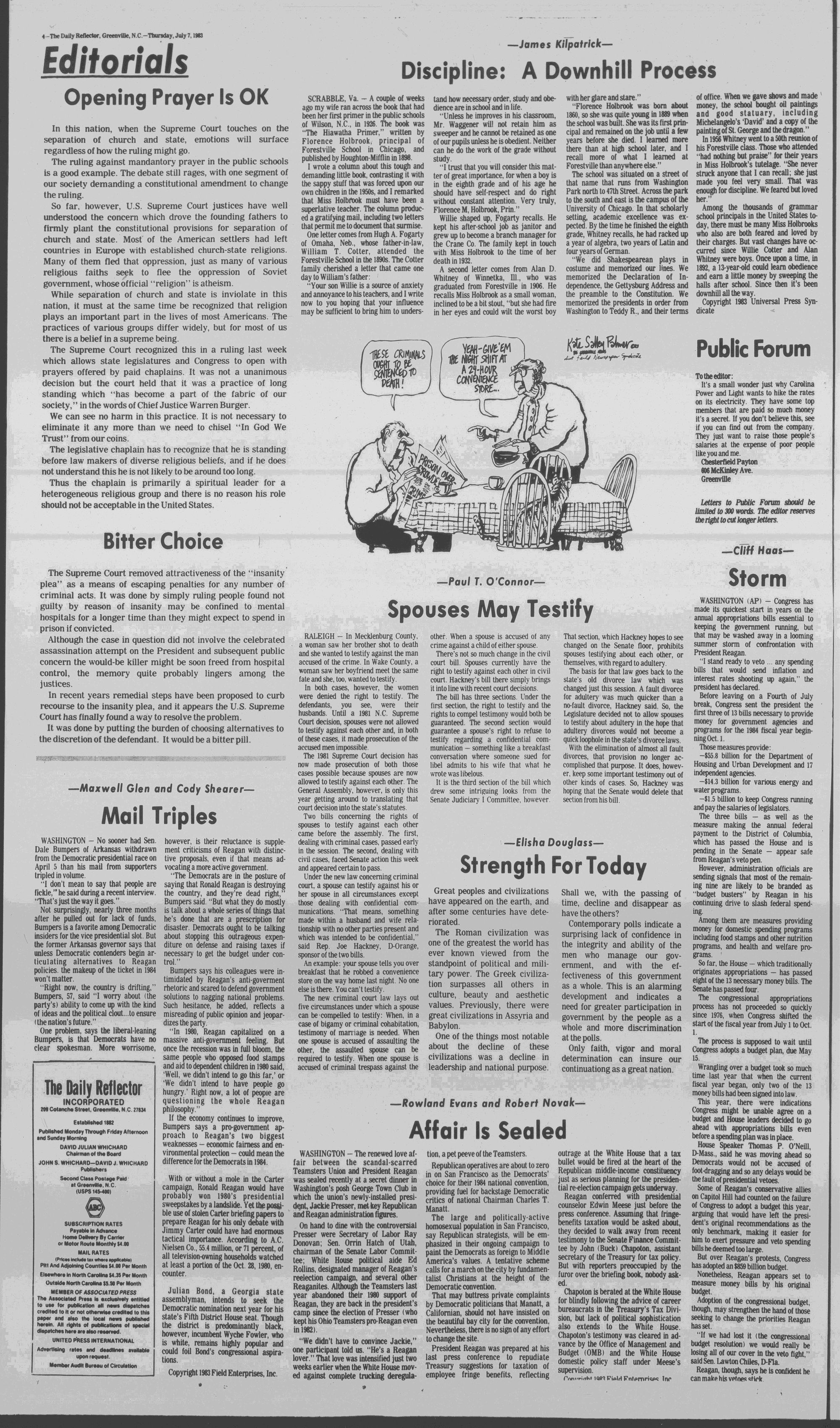 INSIDE TODAYTHE LEGISLATUREThe General Assembly is taking up discussion of proposals banning slavery among migrant farm workers. (Page 17) ^HANGMAN'S NOOSEThe British Parliament may approve restoration of capital punishment, returning the hangmans noose to its place in English history. (Page 8)