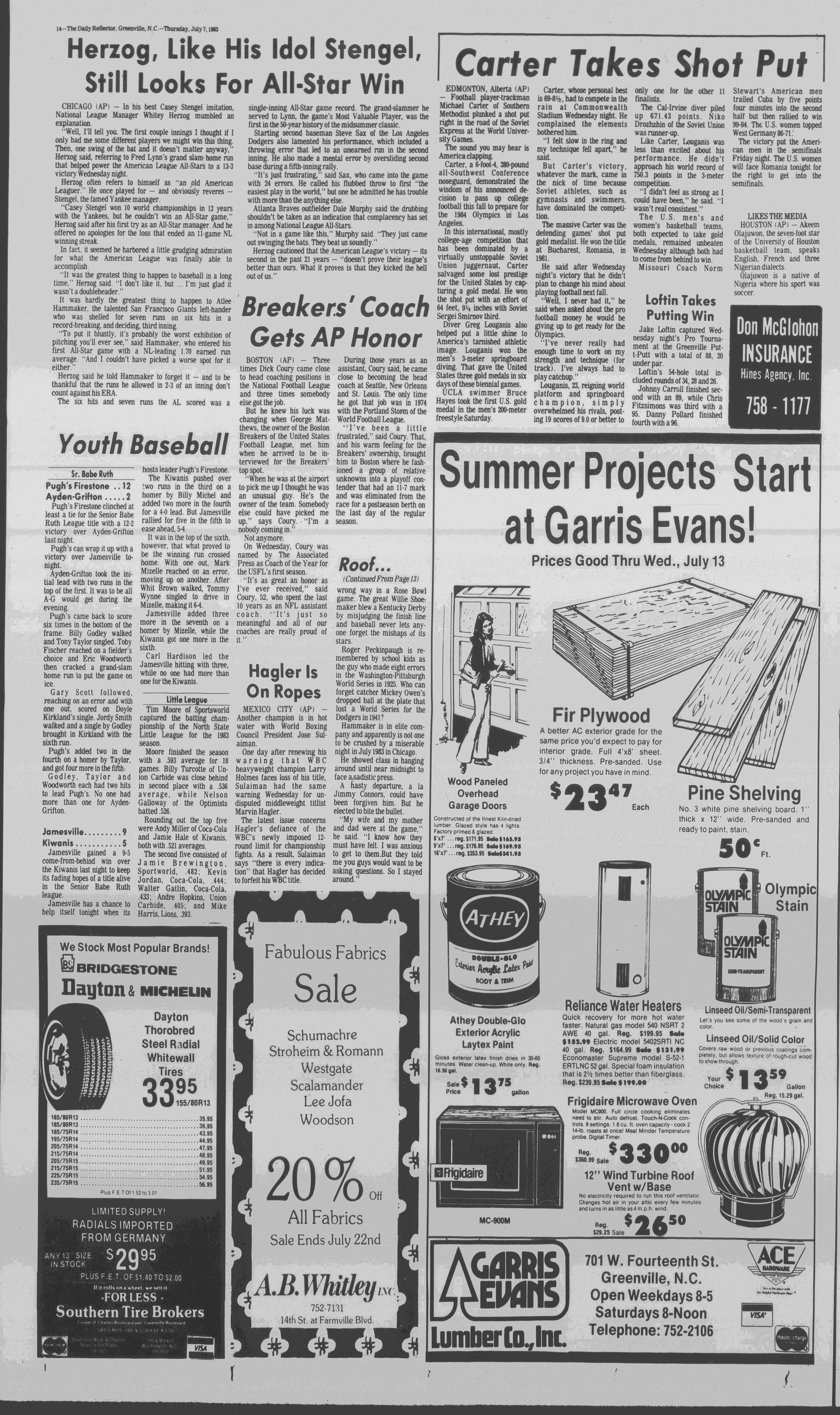 The Fourth of July celebration held here each year is a gift to the Greenville community from the Greenville Jaycees. Greenville Jaycee Doug Hill is the federally licensed pyrotechnician who directs the fireworks show. He was assisted this year by 14 other Jaycees. Materials for this years show cost about $7,000, This money was donated by the local Pepsi-Cola bottling company, with advertising paid for by the Jaycees themselves.
