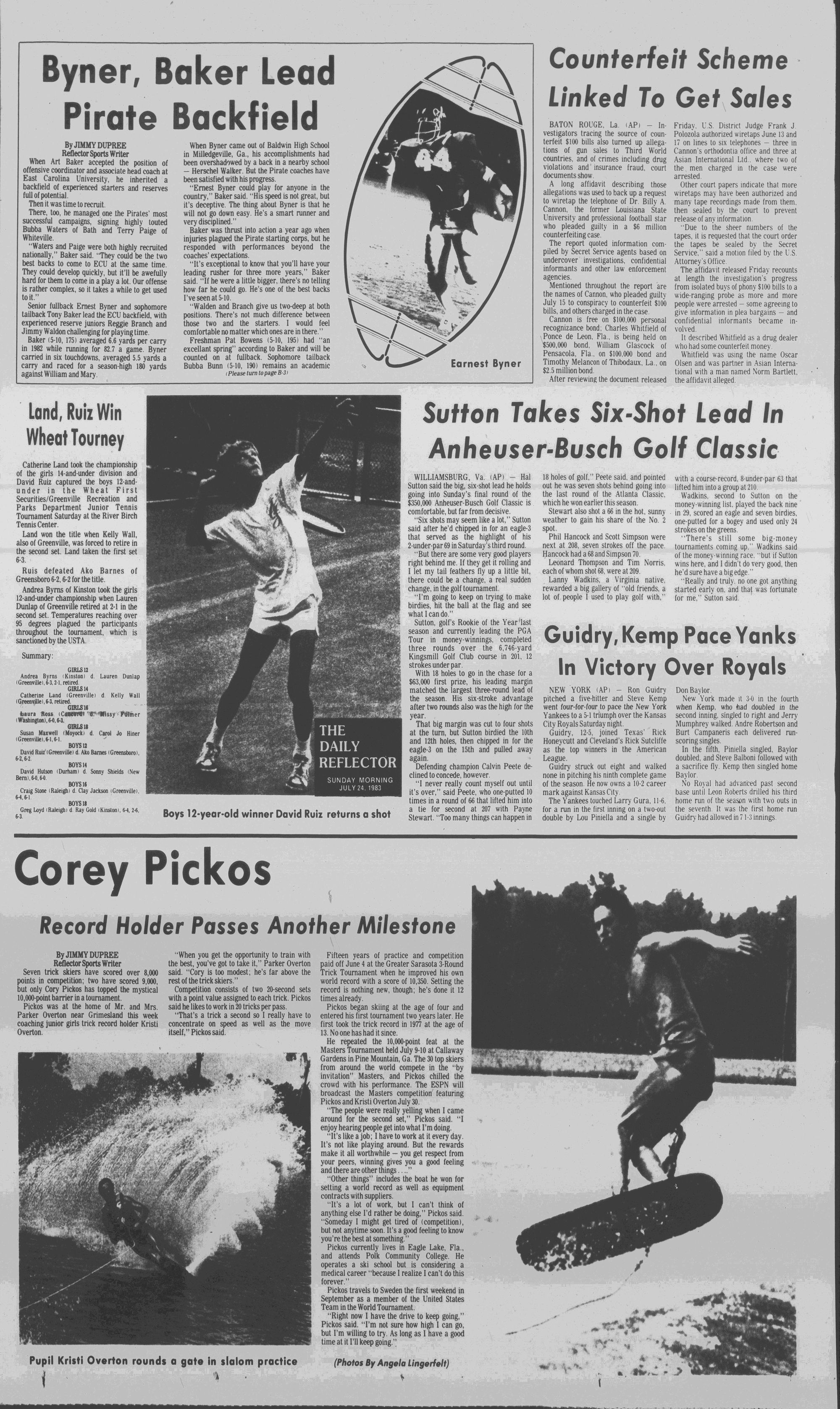 Cory Pickos, world record holder in trick skiing, coached Greenvilles Kristi Overton this week. (Page B-1)