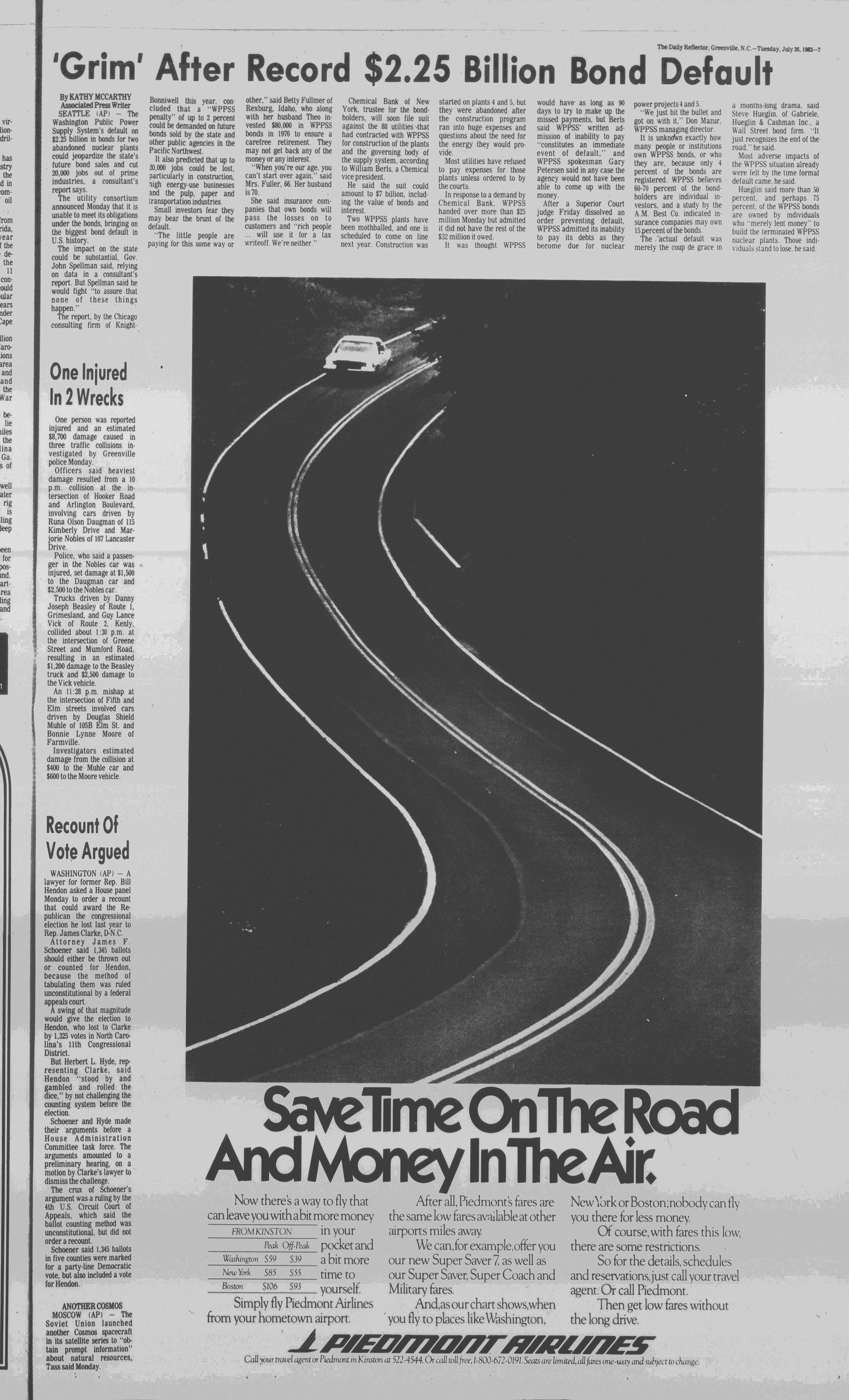 Power systems default of $2.25 billion in bonds jeopardize Washingtons future bond sales anc many industrial jobs. (Page 7)