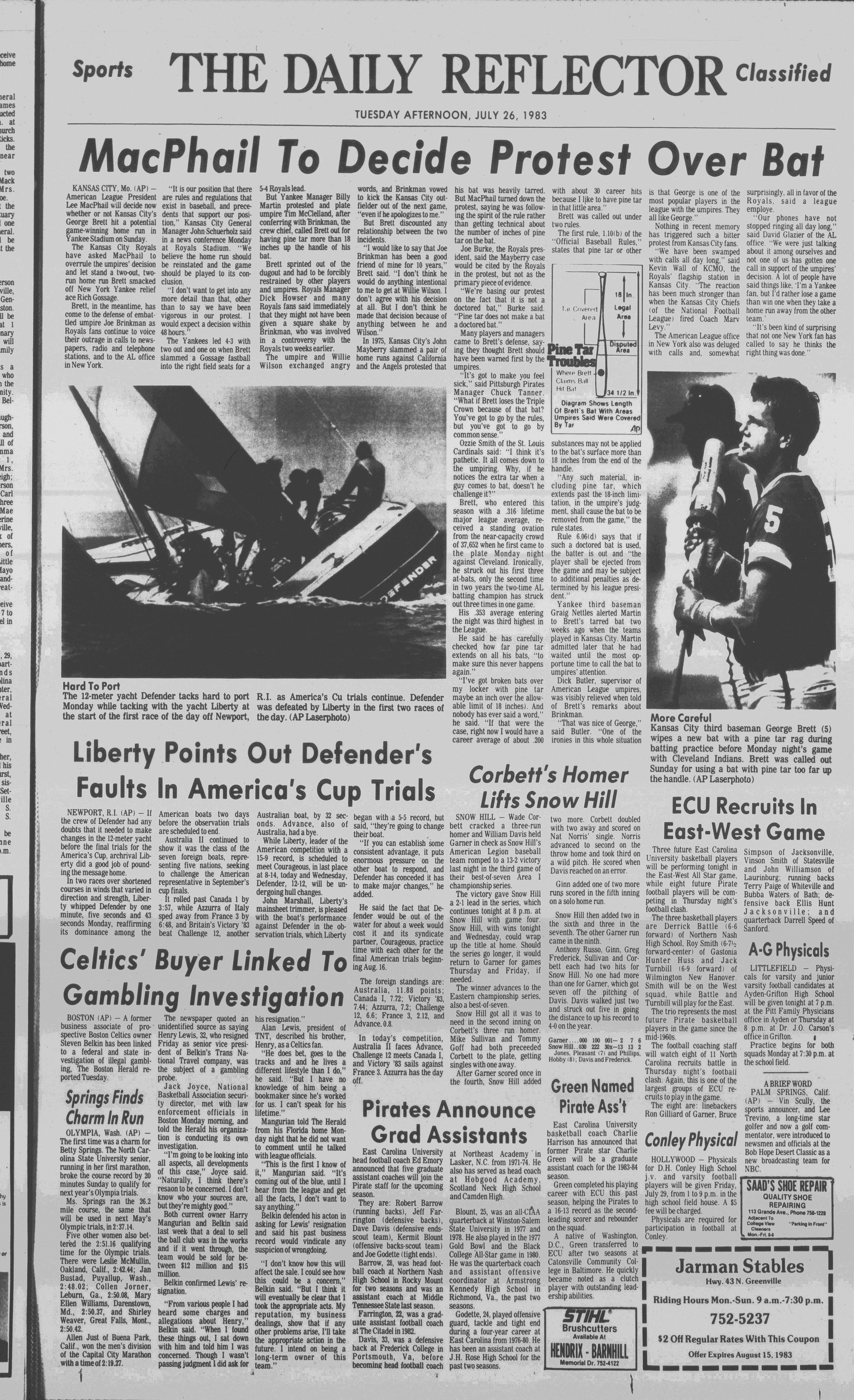 The debate continues over George Bretts illegal bat as the outcome of Kansas Citys protest is awaited. (Page 9) *THE DAILY REFLECTOR