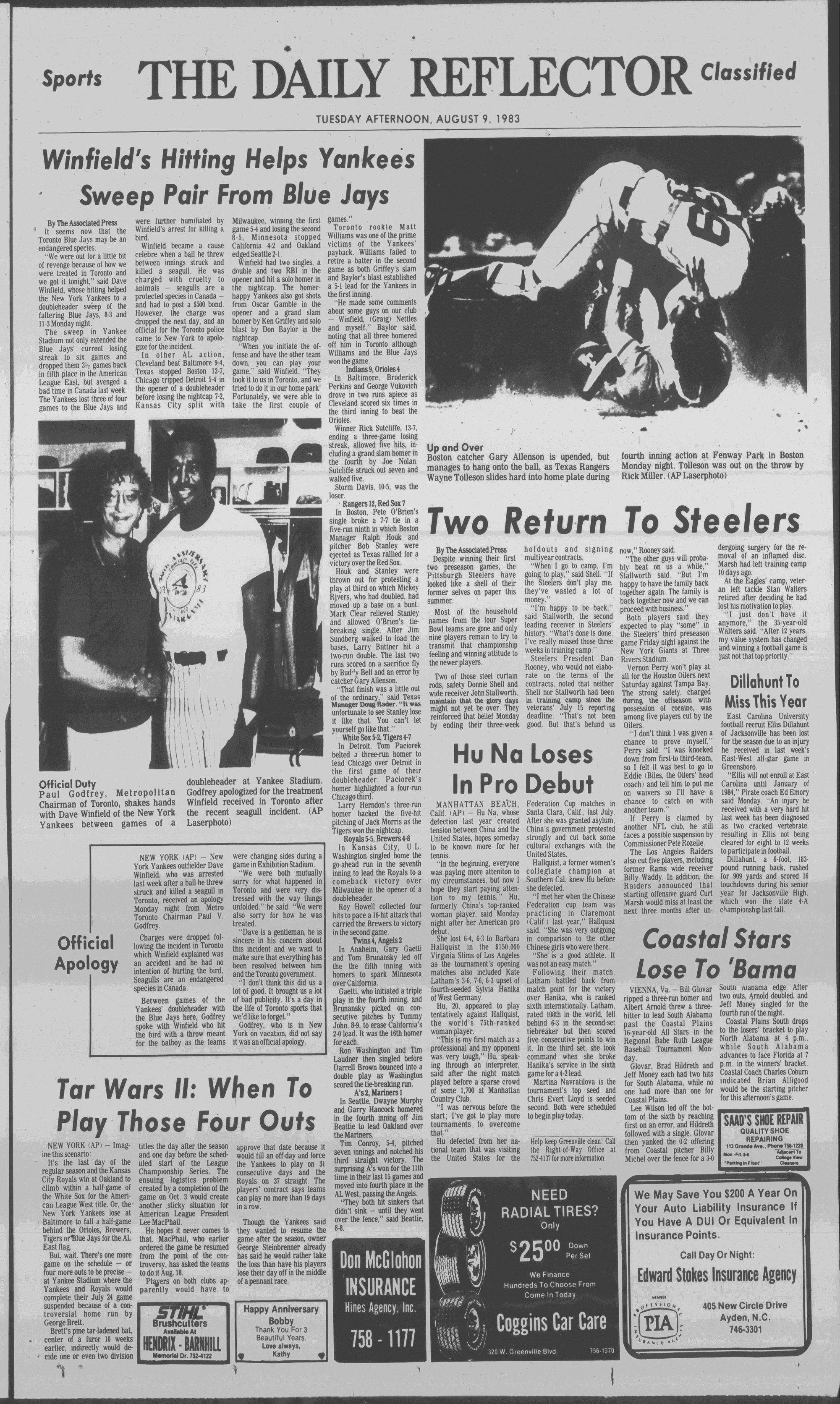 Dave Winfield continues to be a bird killer as he helps the Yankees sweep two from the Blue Jays. (Page 9)