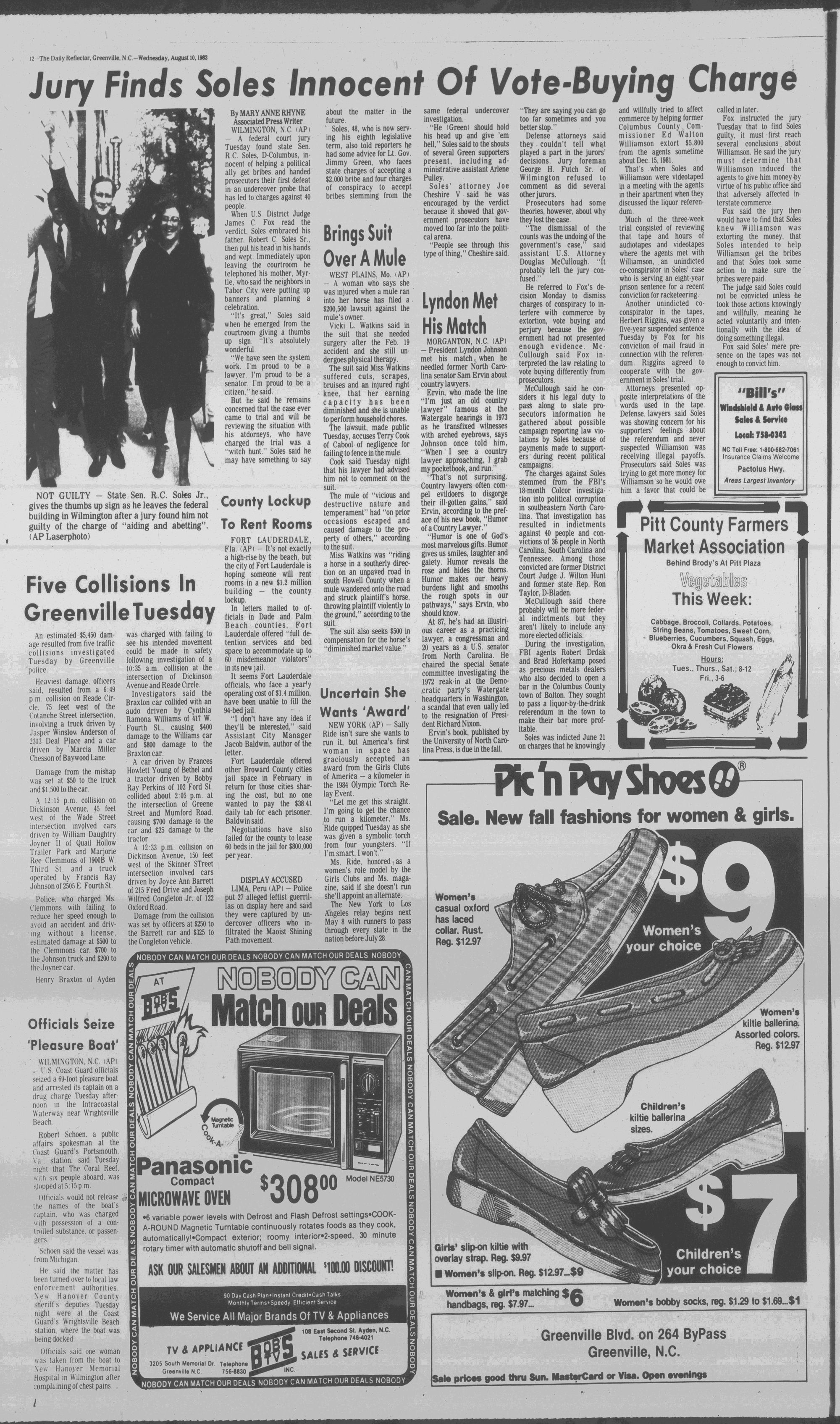 A federal court jury has found state Sen. R.C. Soles innocent of helping a political ally get bribes, handing prosecutors their first defeat. (Page 12)