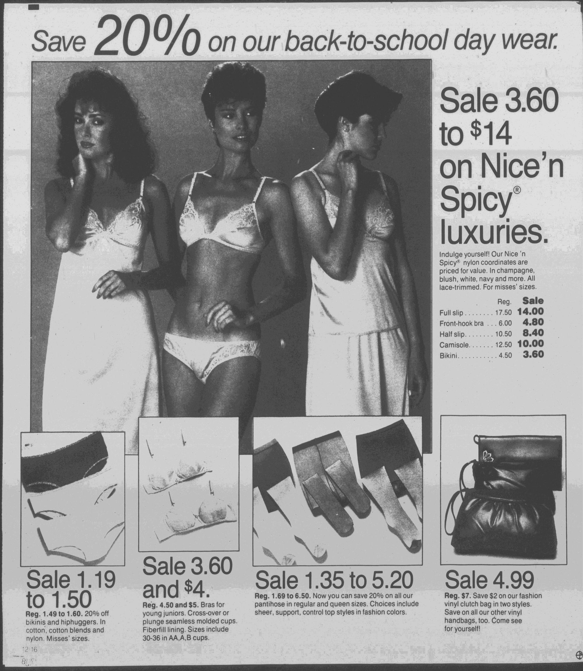 bikinis and hiphuggers. In cotton, cotton blends and nylon. Missessizes.