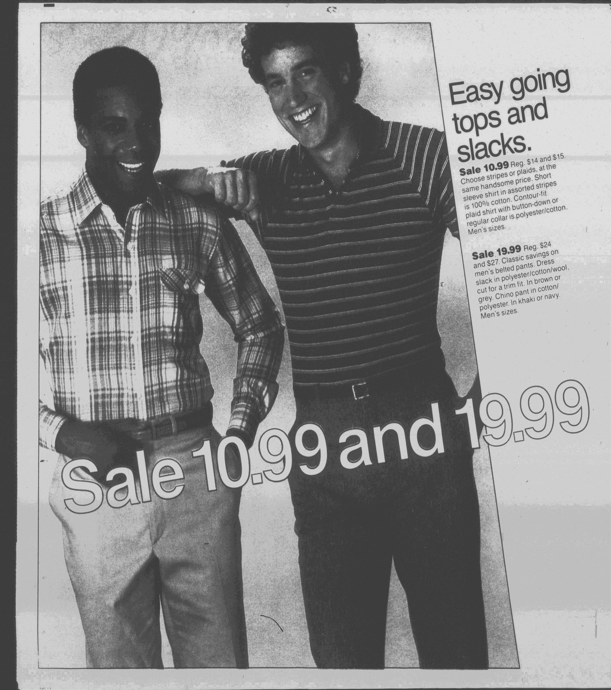 Orig. ttS tiifl tf4. He^ yourself to savings on shHts with real tehion :. dividends. In easy^are polyester/ -(Mtton. Start with tong stere tailored shifts. One plaid brofcioth. one in stdpeoxtorid cloth. Both with button