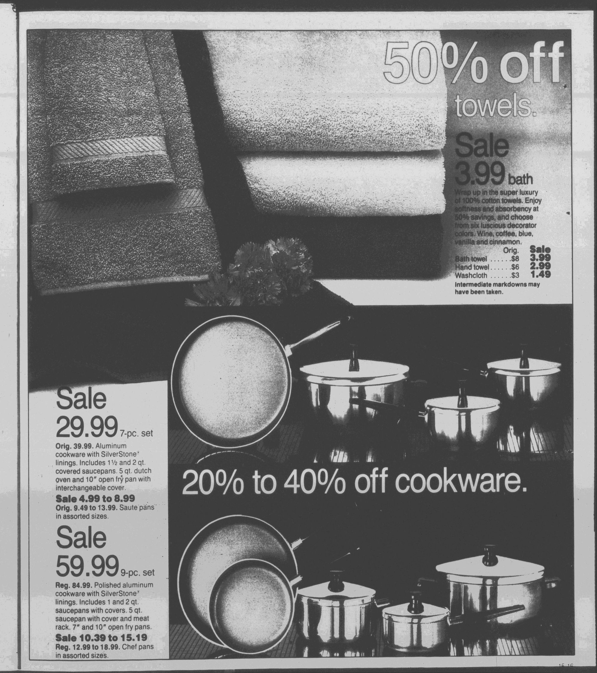 Reg. 84.99. Polished aluminum cookware with SilverStone linings. Includes 1 and 2 qt. saucepans with covers. 5 qt. saucepan with cover and meat rack. 7" and 10" open fry pans.Sale 10.39 to 15.19