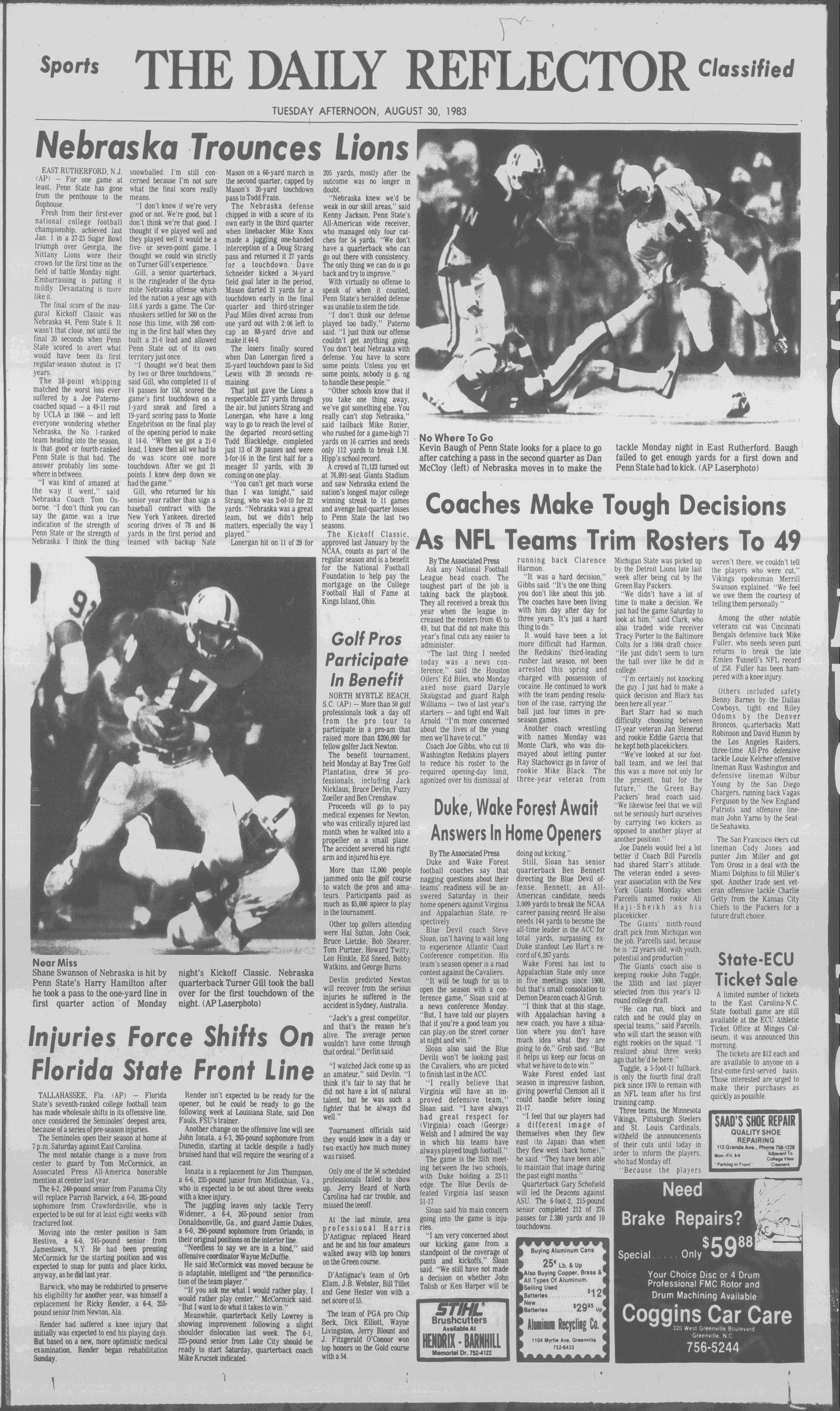 Nebraskas Number One ranked Cornhuskers romped to a 44-6 victory over defending champion Penn State last night. (Page 9)THE DAIL^ REFLECTOR