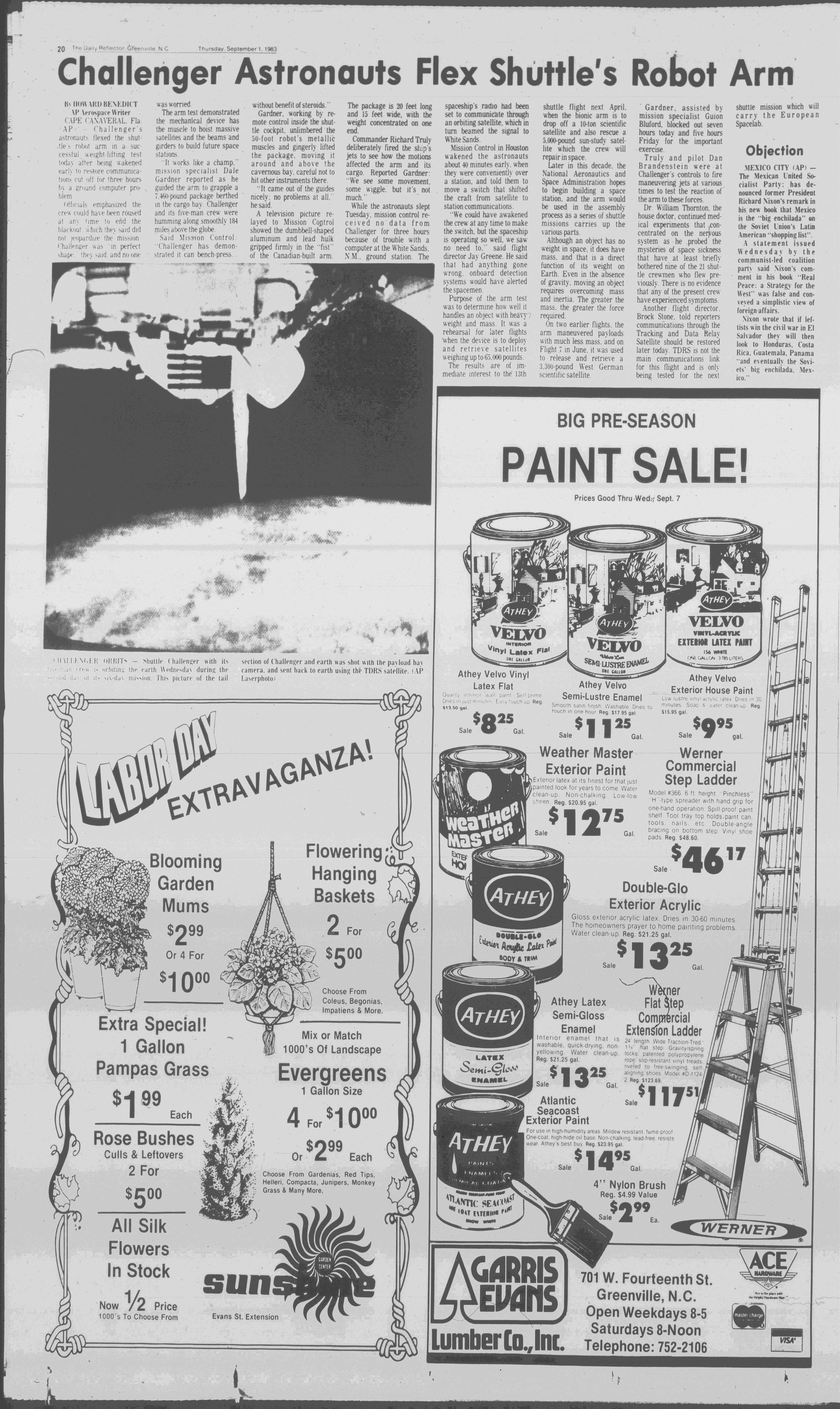 Challenger5 astronauts test shuttles robot arm for hoisting a 7,460-pound package berthed in cargo bay without the benefit of steroids. (Page 20)