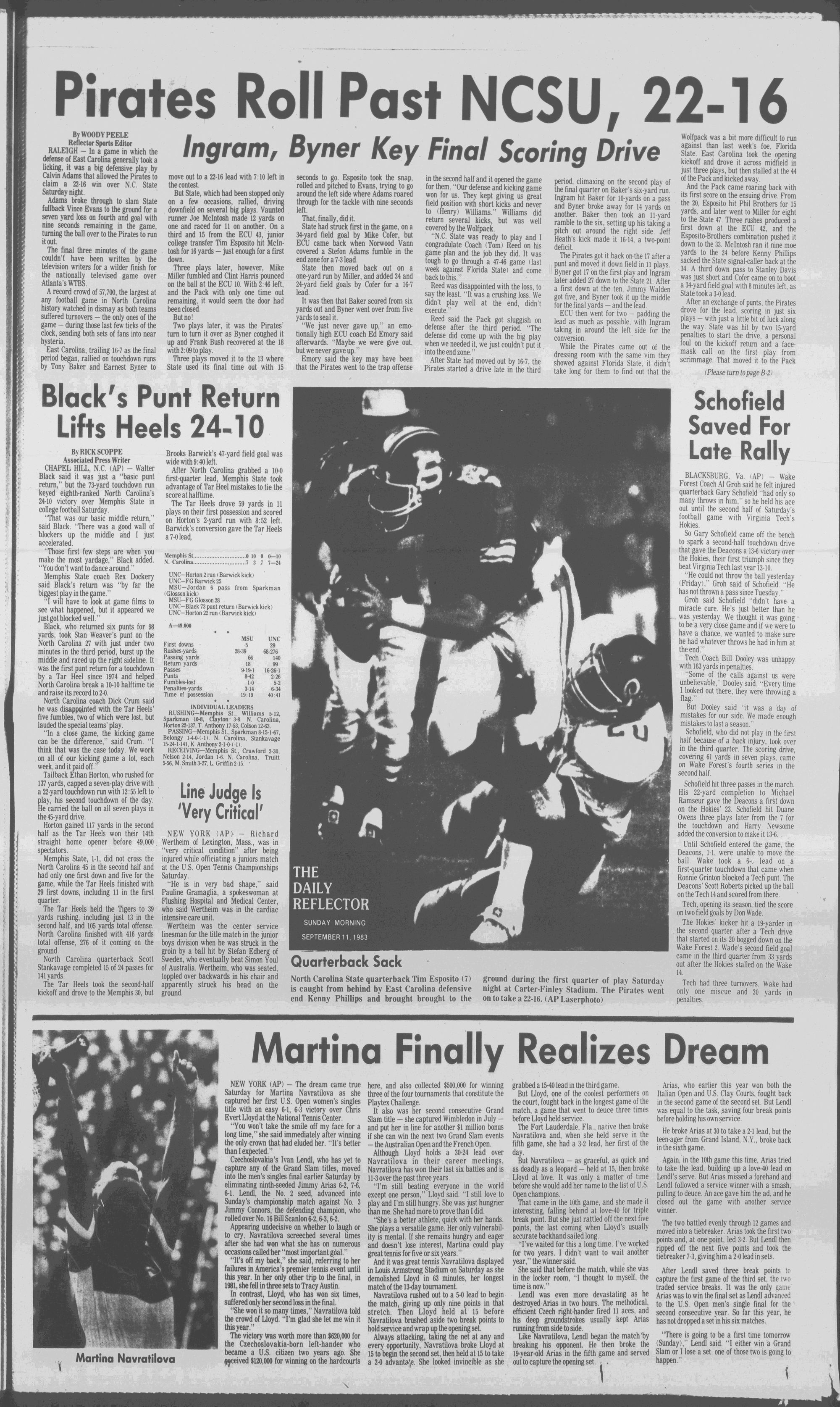 East Carolina rallied in the fourth quarter for a 22-16 victory over NCSU on an Earnest Syner touchdown. Page B-1