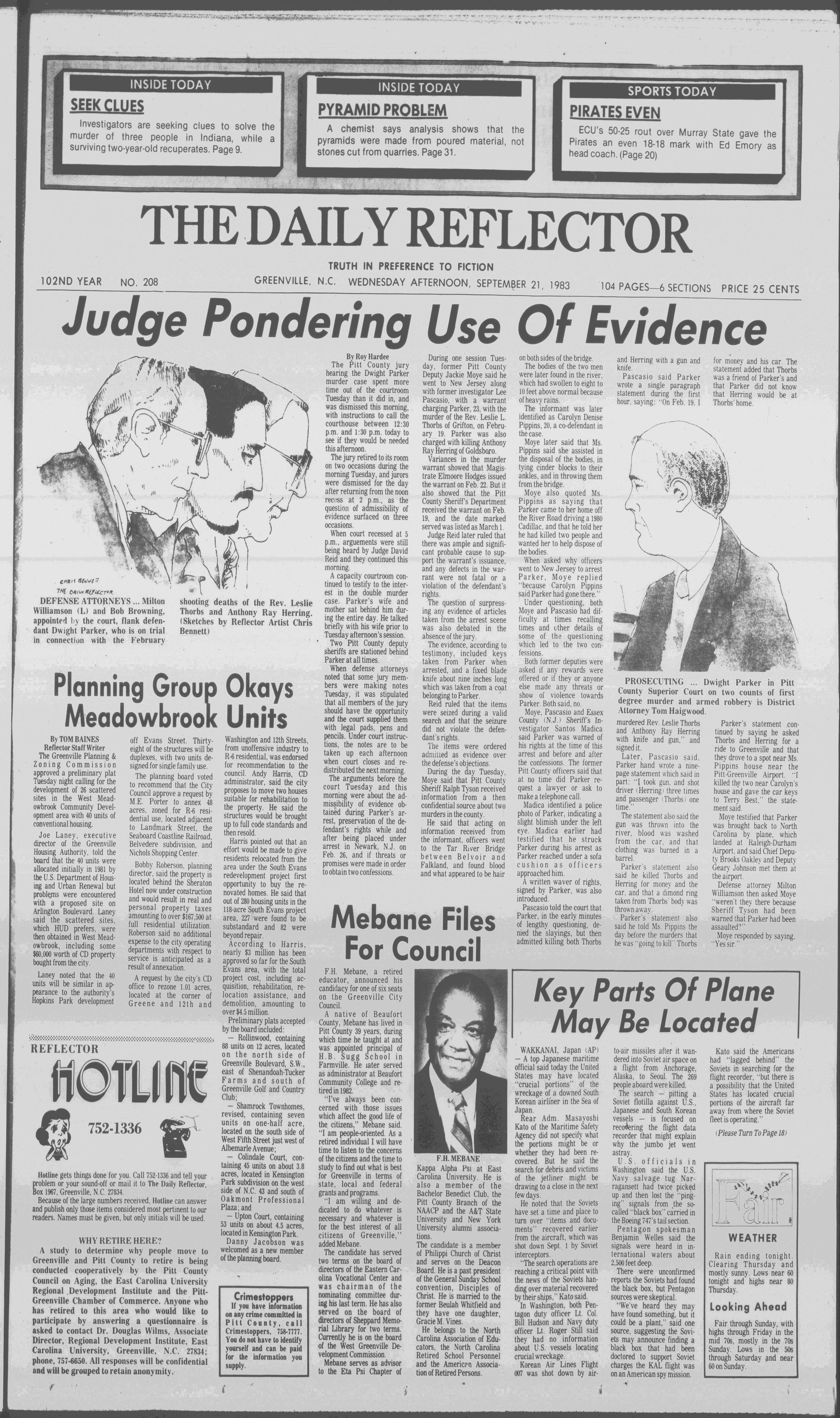GREENVIllE, N.C. WEDNESDAY AFTERNOON, SEPTEMBER 21, 1983    104    PAGES-6    SECTIONS    PRICE    25    CENTSJudge Pondering Use Of Evidence